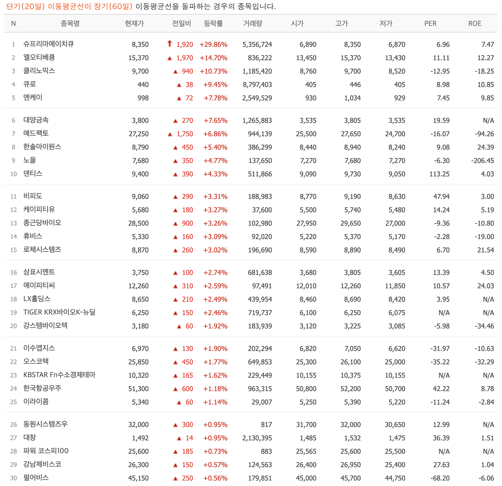 골든크로스(Golden Cross)는 기술적 분석에서 매우 중요한 신호 중 하나입니다. 이 신호는 더 긴 기간의 상승 추세가 시작될 가능성이 높다는 것을 나타냅니다. 골든 크로스 발생 종목은 슈프리마에이치큐,엘오티베큠,클리노믹스,큐로,엔케이,대양금속,메드팩토,한솔아이원스,노을,덴티스,비피도,케이피티유,종근당바이오,휴비스,로체시스템즈,삼표시멘트,에이피티씨,LX홀딩스,강스템바이오텍,이수앱지스,오스코텍,한국항공우주,이라이콤,동원시스템즈우,대창,강남제비스코,펄어비스,제노코,아미노로직스,넥스턴바이오,램테크놀러지,네온테크,팅크웨어,더블유씨피,티엘비입니다.
