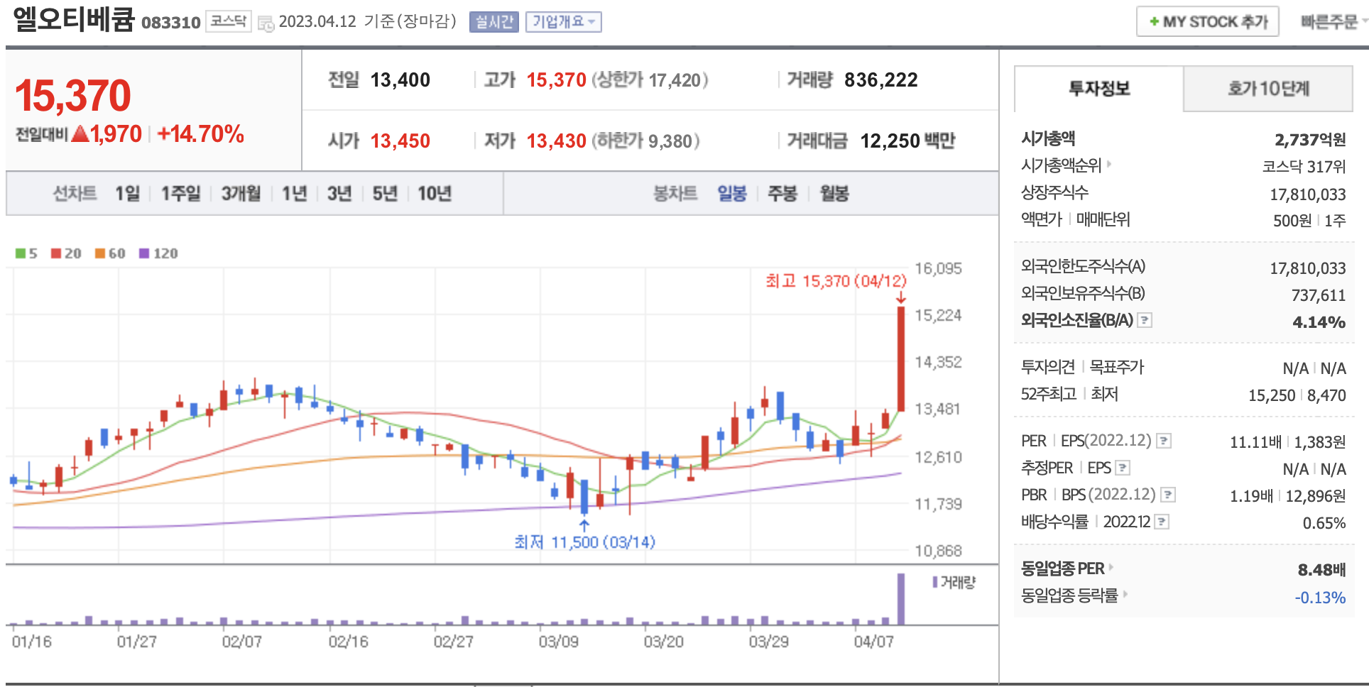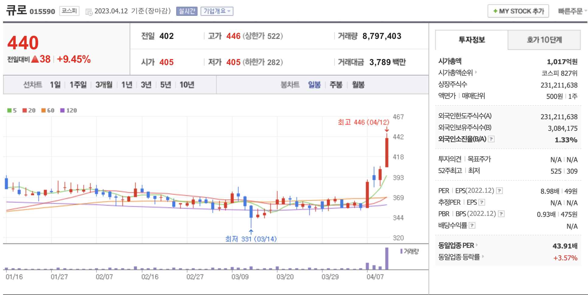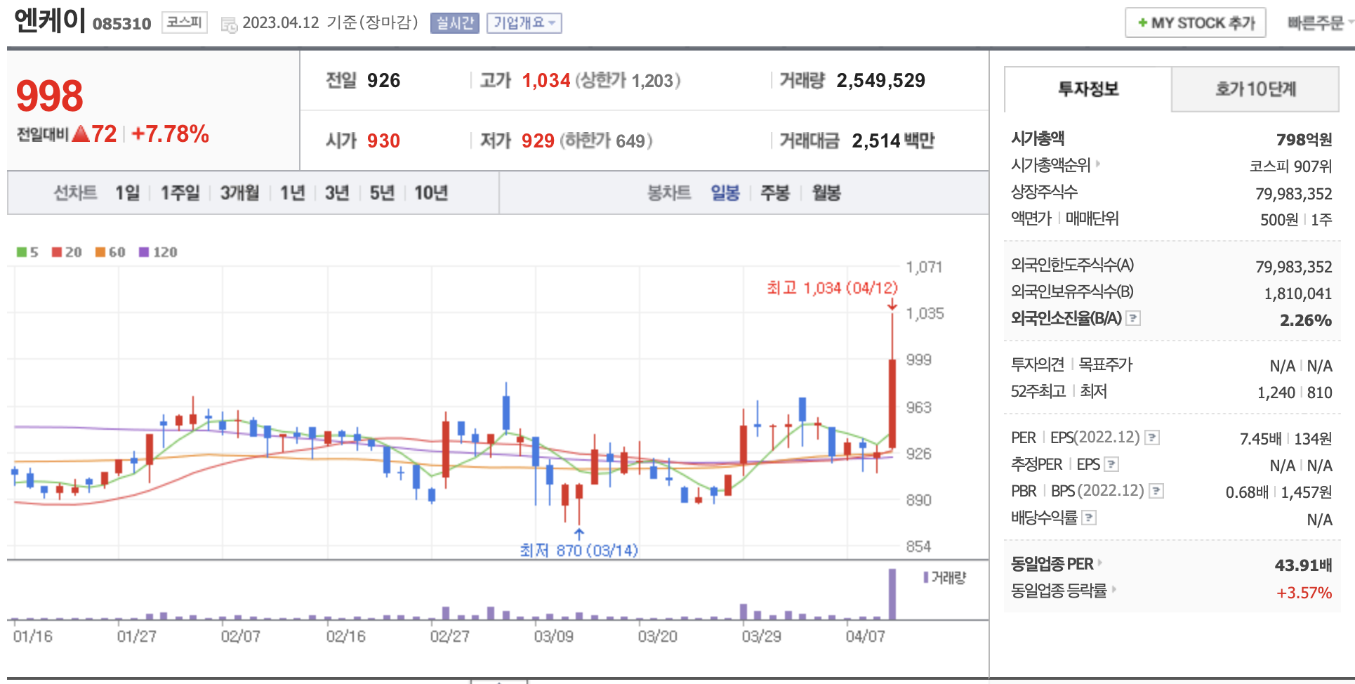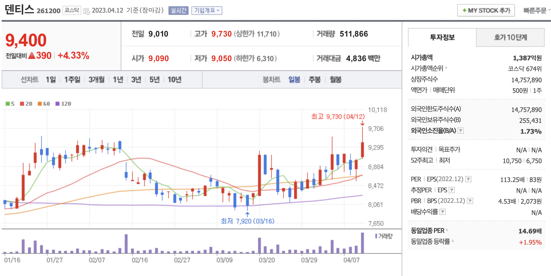 2023년 4월 12일 골든크로스 발생 주식 종목 정보 : 슈프리마에이치큐,엘오티베큠,클리노믹스,큐로,엔케이,대양금속,메드팩토,한솔아이원스,노을,덴티스,비피도,케이피티유,종근당바이오,휴비..