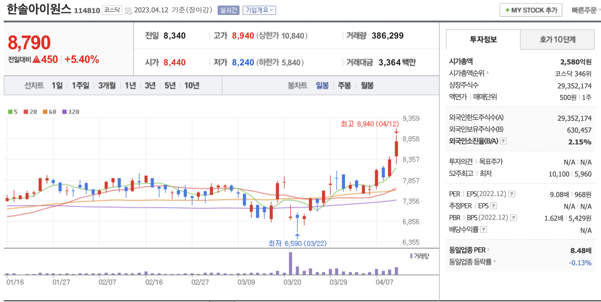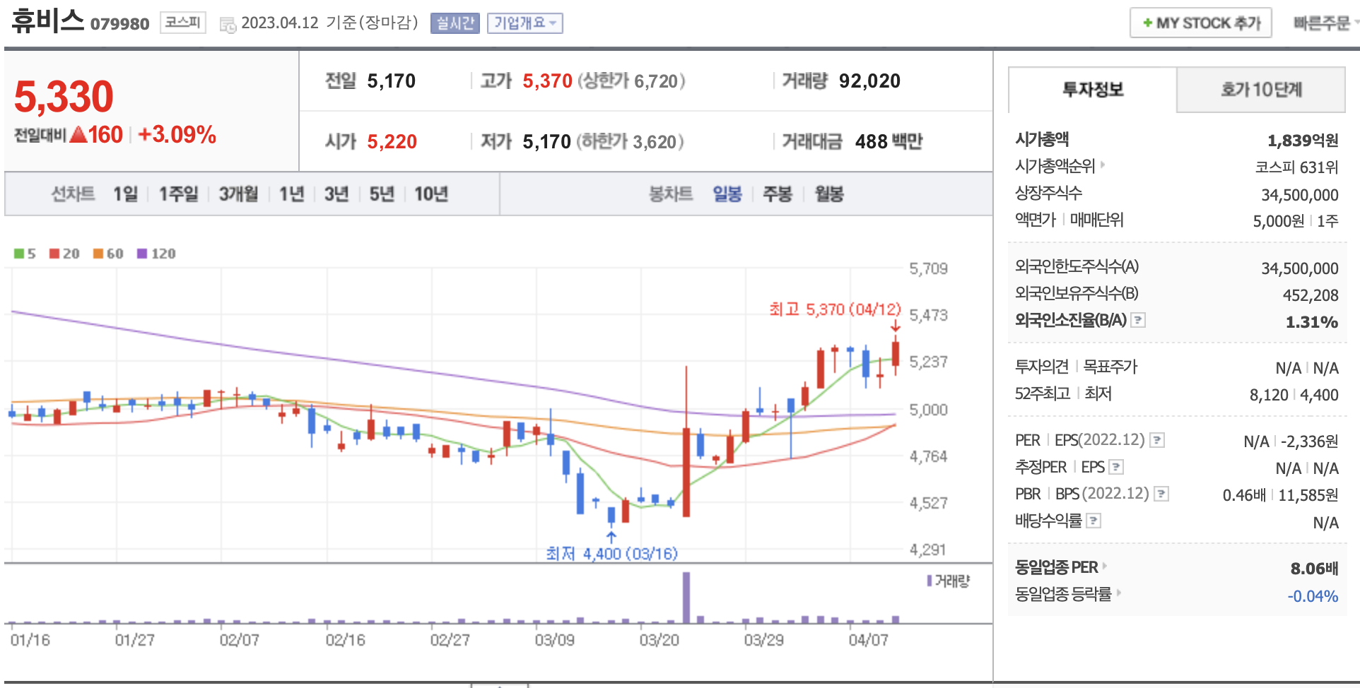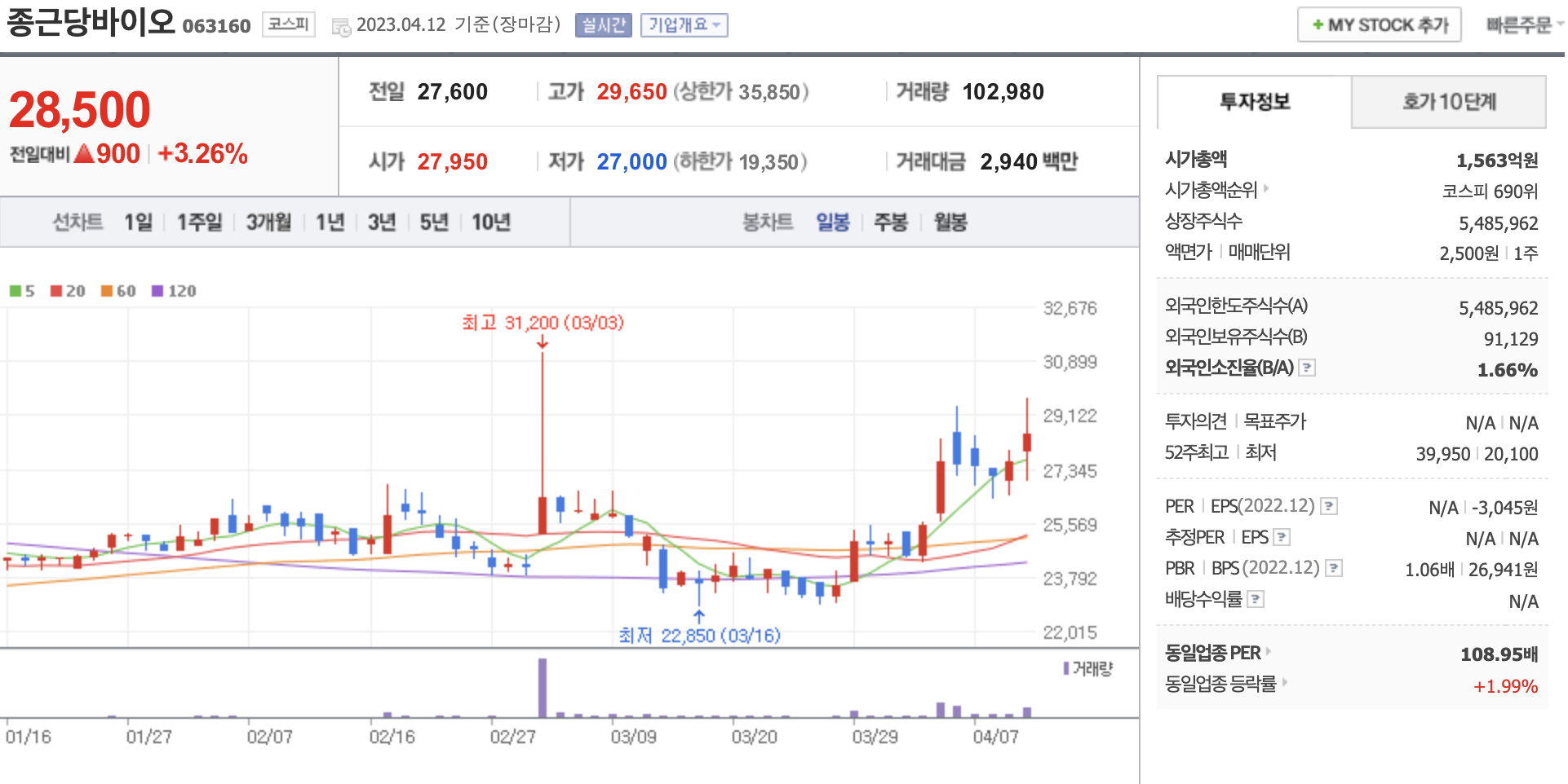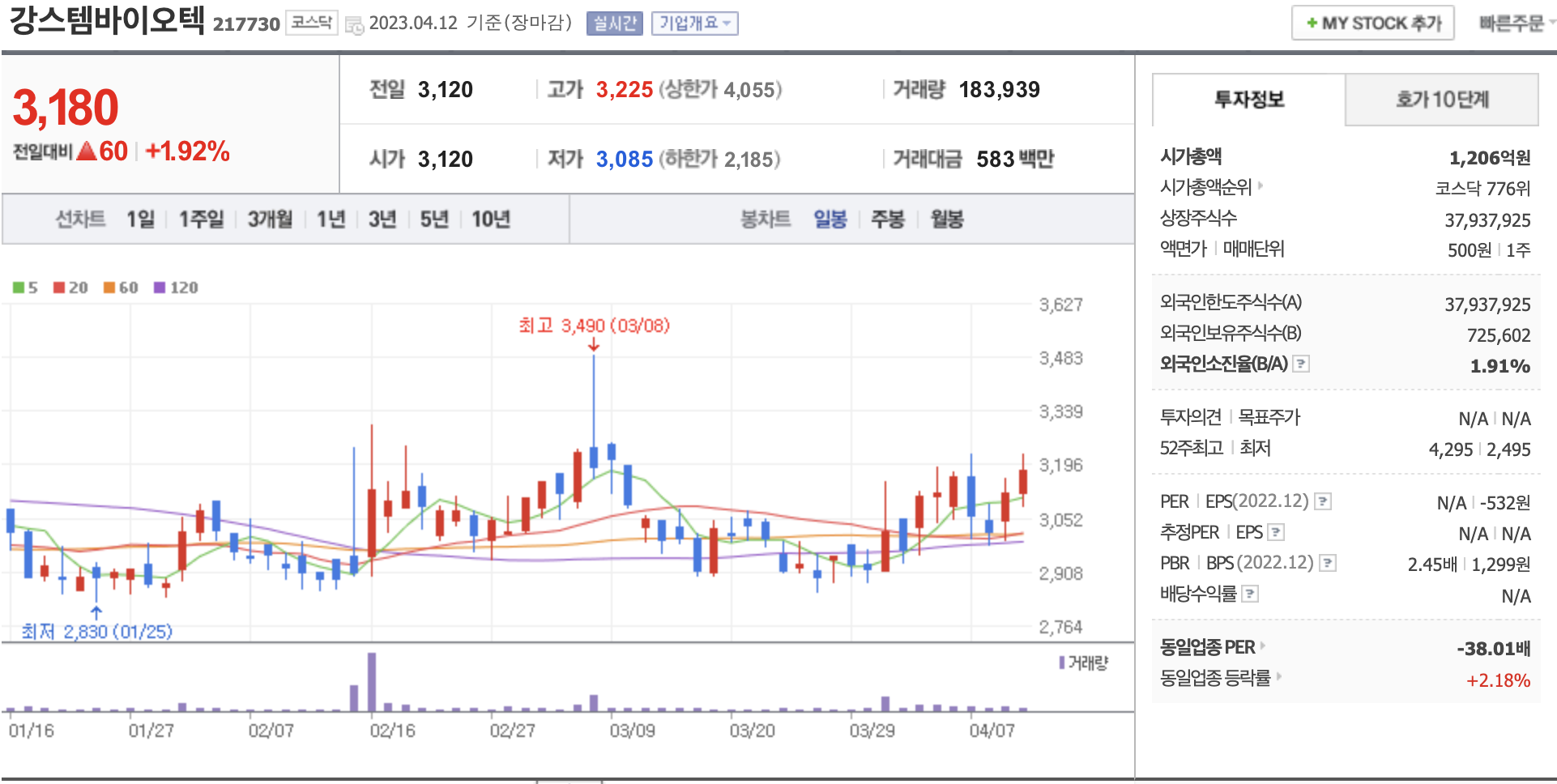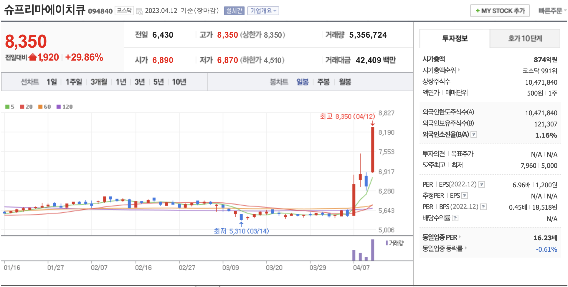 2023년 4월 12일 골든크로스 발생 주식 종목 정보 : 슈프리마에이치큐,엘오티베큠,클리노믹스,큐로,엔케이,대양금속,메드팩토,한솔아이원스,노을,덴티스,비피도,케이피티유,종근당바이오,휴비..