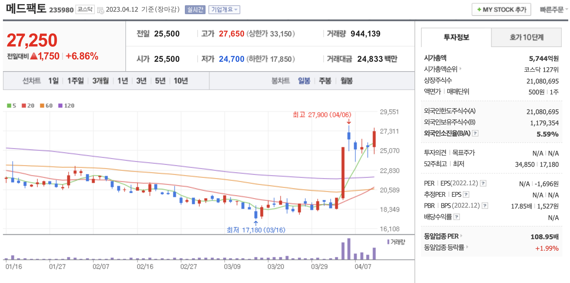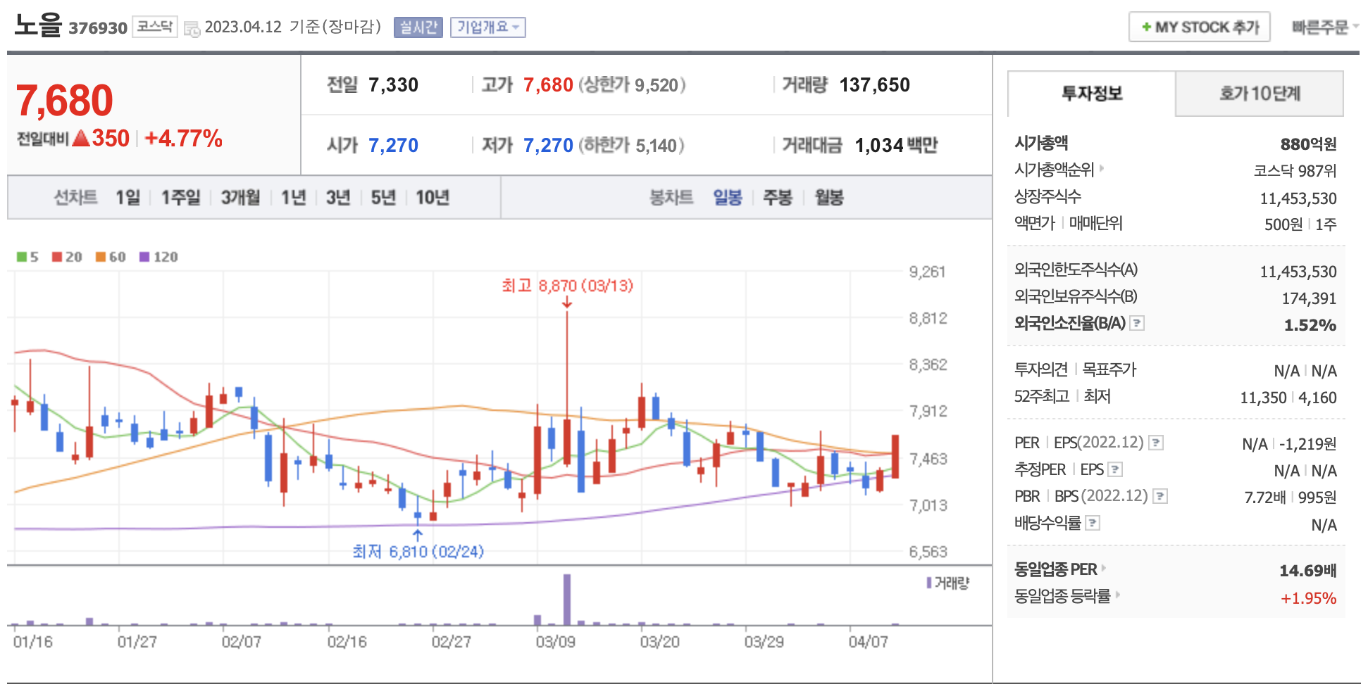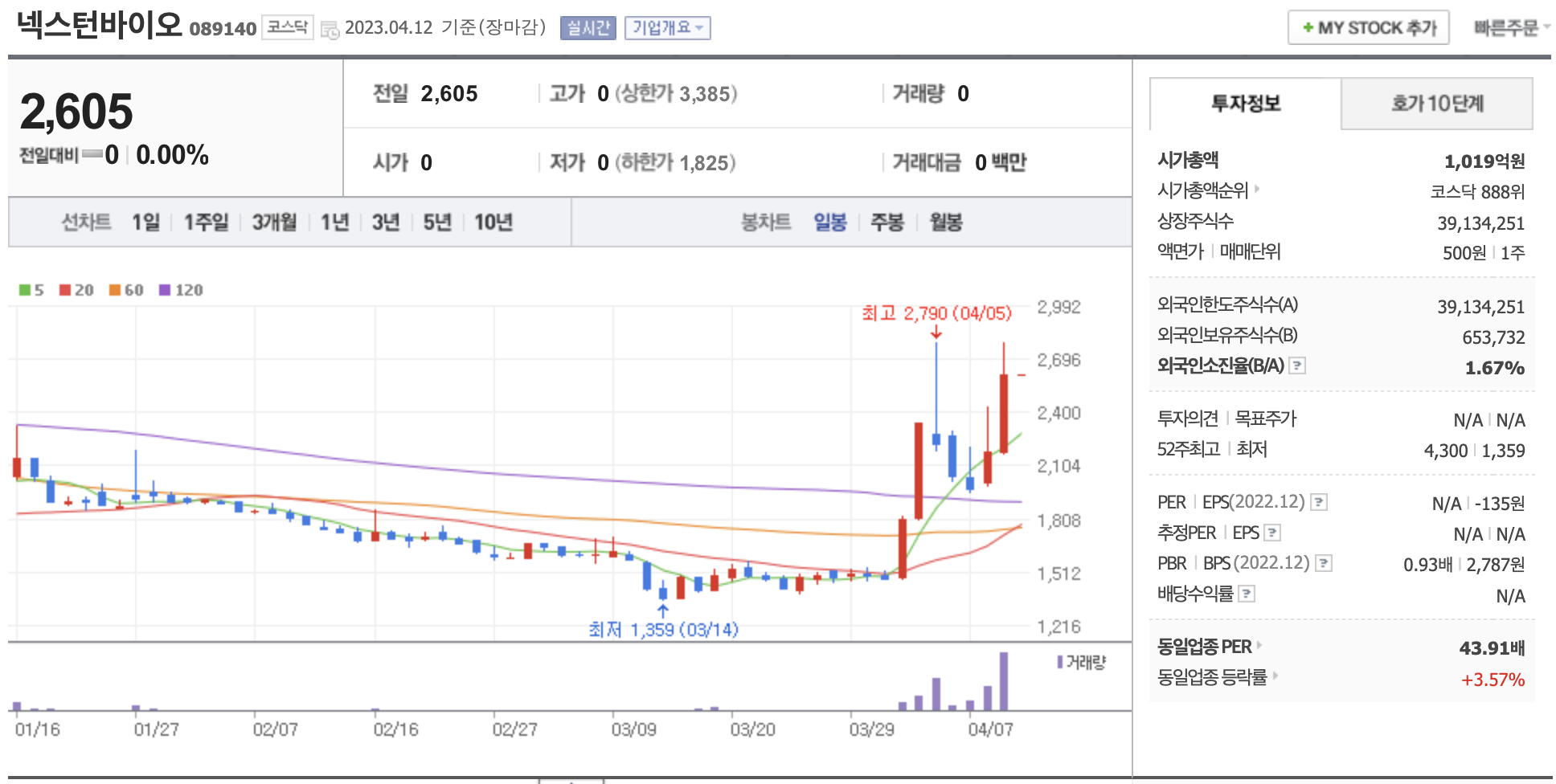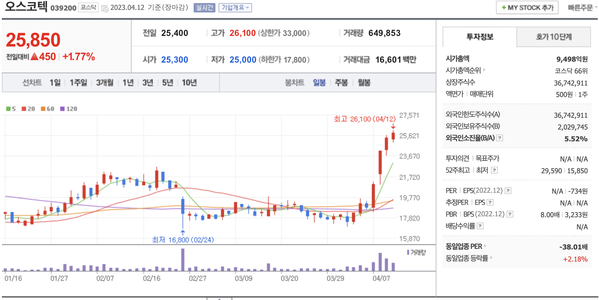2023년 4월 12일 골든크로스 발생 주식 종목 정보 : 슈프리마에이치큐,엘오티베큠,클리노믹스,큐로,엔케이,대양금속,메드팩토,한솔아이원스,노을,덴티스,비피도,케이피티유,종근당바이오,휴비..