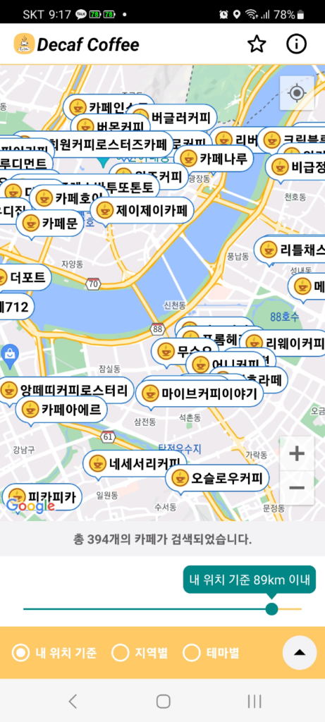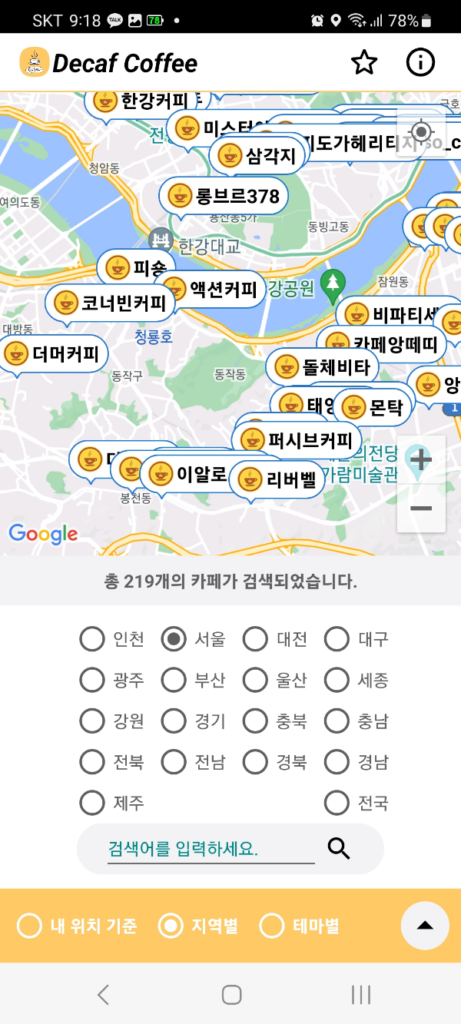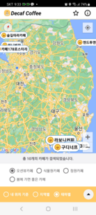 내 위치 기준 또는 지역별로 디카페인 커피를 판매하는 카페를 찾아주는 앱입니다.