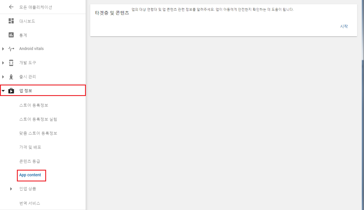 앱 컨텐츠(App Content) 메뉴를 클릭하여 “타겟층 및 콘텐츠” 설문를 알아본다.
