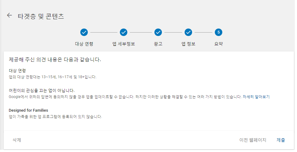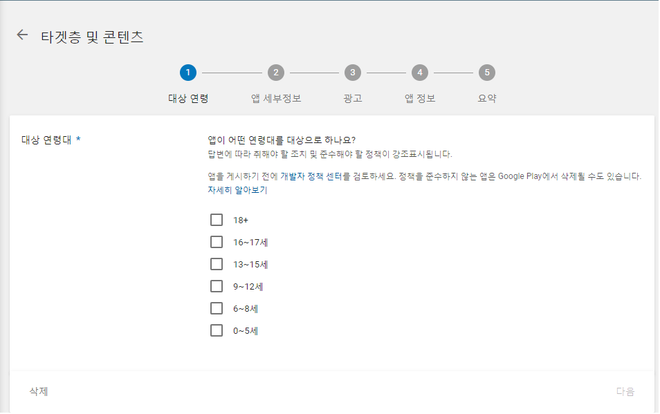 8월말까지 개발자콘솔-앱정보 – 앱 컨텐츠 메뉴를 클릭하여 “타겟층 및 콘텐츠” 설문을 작성하여야한다.