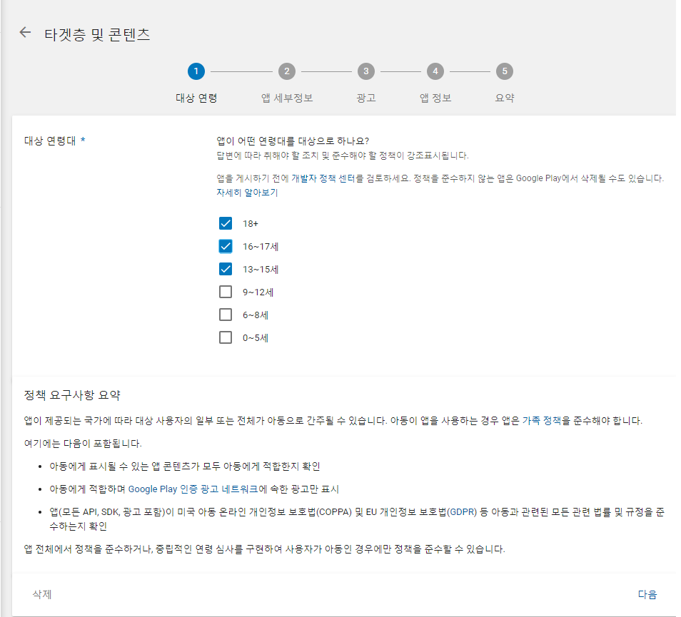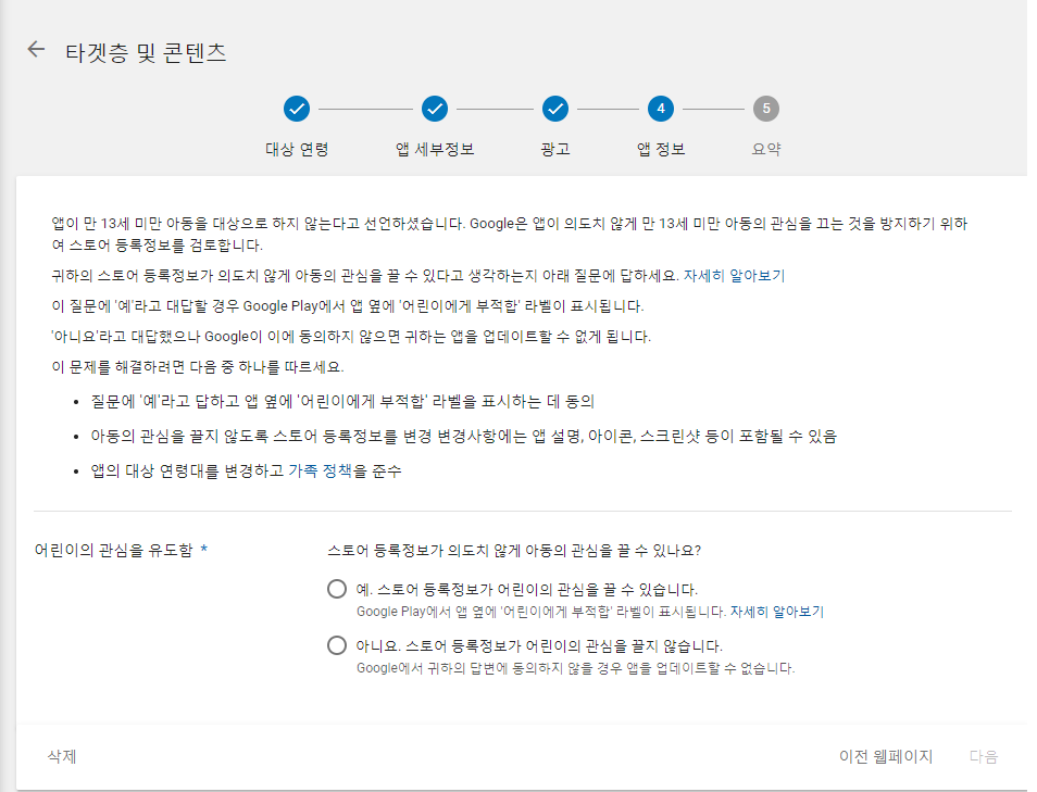 컨텐츠 등급이 3세이하일 경우이다. 내가 만든 앱은 13세미만 어린이를 대상으로 하지않지만