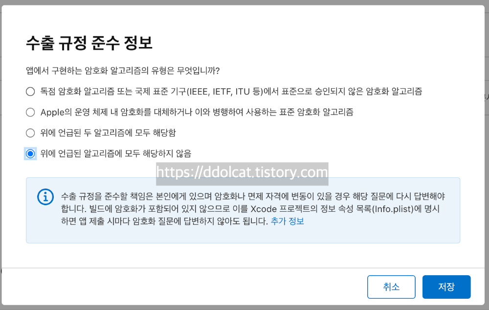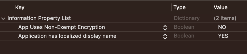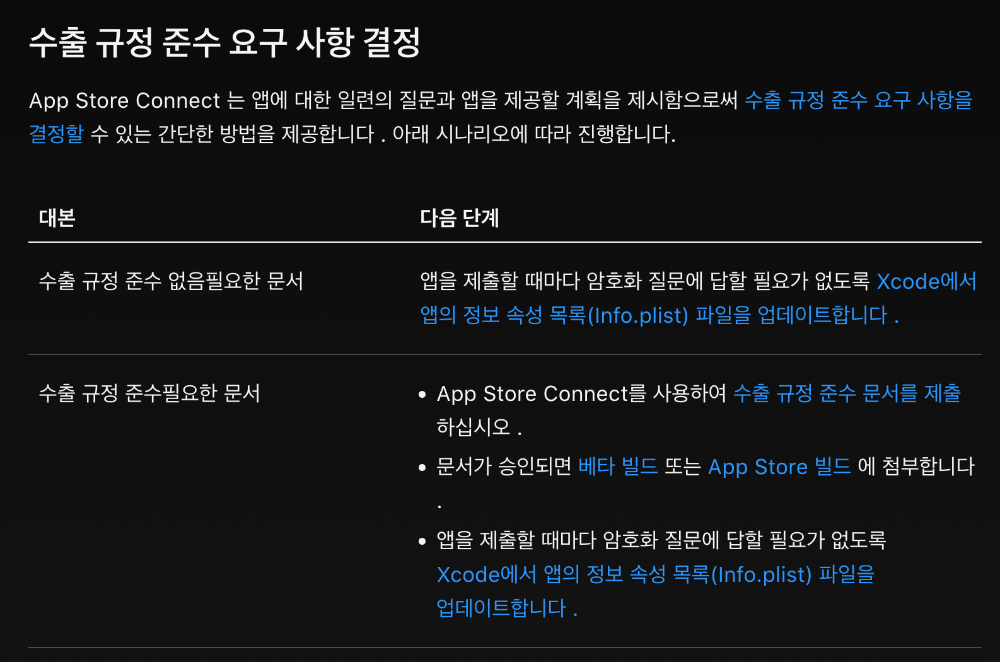 info.plist 파일을 열고 해당 수출 규정 준수가 필요없음 속성을 추가해주면 되는 것 같다.