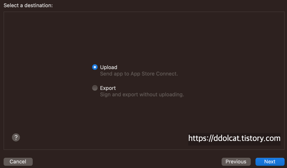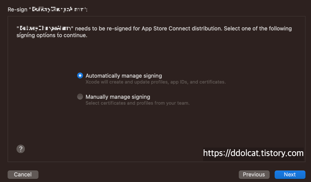 Upload your app’s symbols 와 Manage Version and Build Number체크 후 넘어감