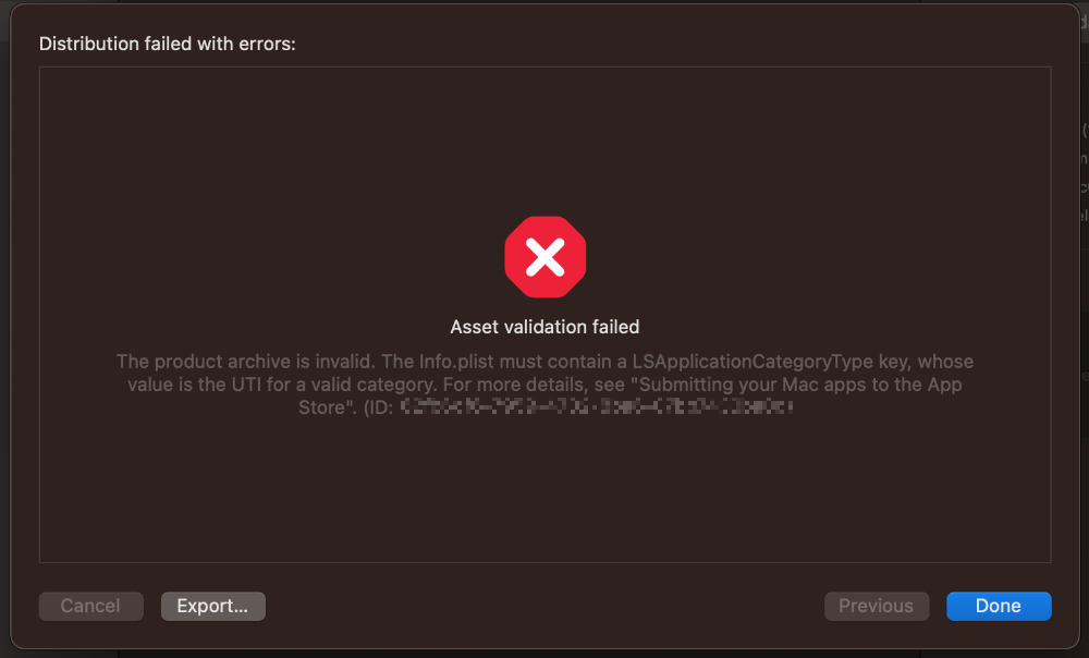 제품 아카이브가 유효하지 않습니다. Info.plist는 LSApplicationCategoryType 키를 포함해야 하며 값은 유효한 카테고리의 UTI입니다. 자세한 내용은 “Mac 앱을 App Store에 제출하기”를 참조하십시오.