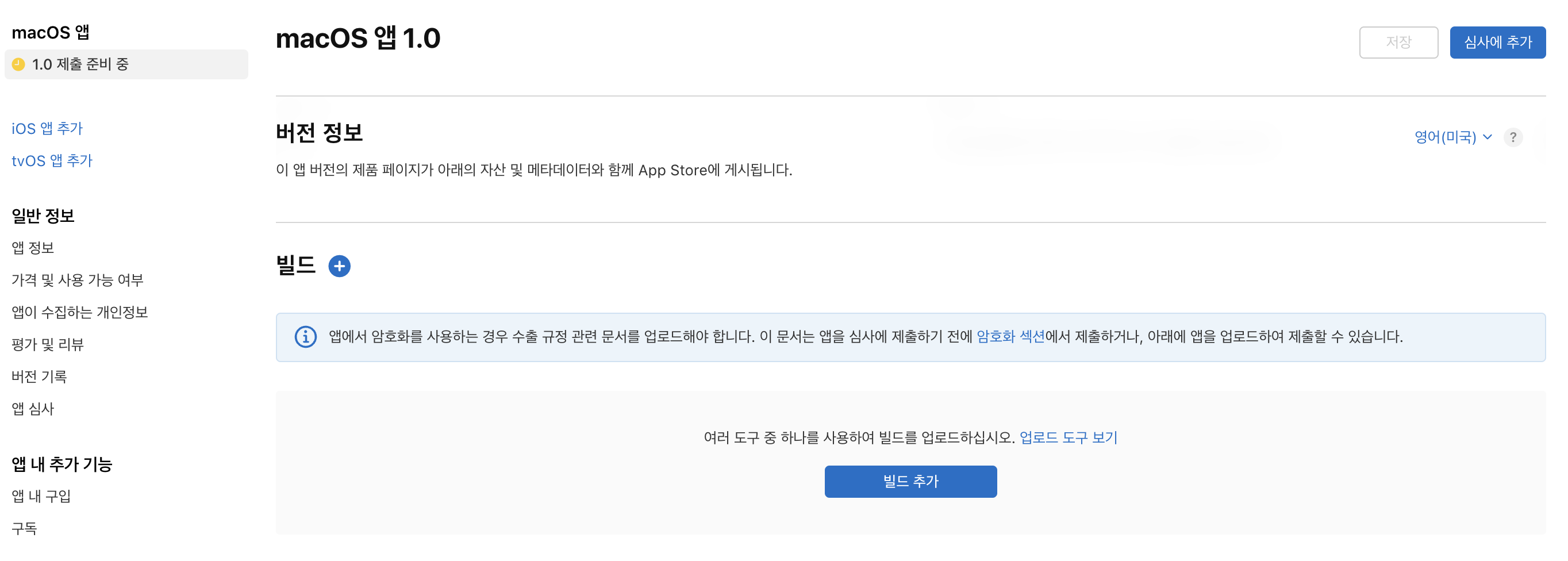 앱스토어커넥트 사이트에서 일반정보 탭 에서 빌드 추가를 클릭!!