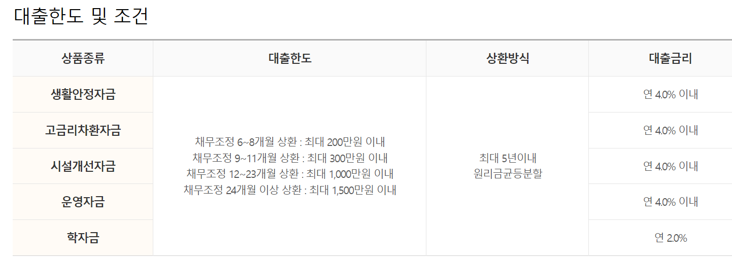 대출금리는 자금용도와 채무조정 변제금 상환기간 등에 따라 다르게 적용되며 기초생활수급자, 장애인, 만 70세 이상 고령자, 한부모가족 등의 경우 기본금리의 70%가 적용된다. 대출 신청일 기준 2개월 이내 신용교육원(www.educredit.or.kr) 온라인 교육 이수자의 경우 0.1%p 우대금리가 적용된다.