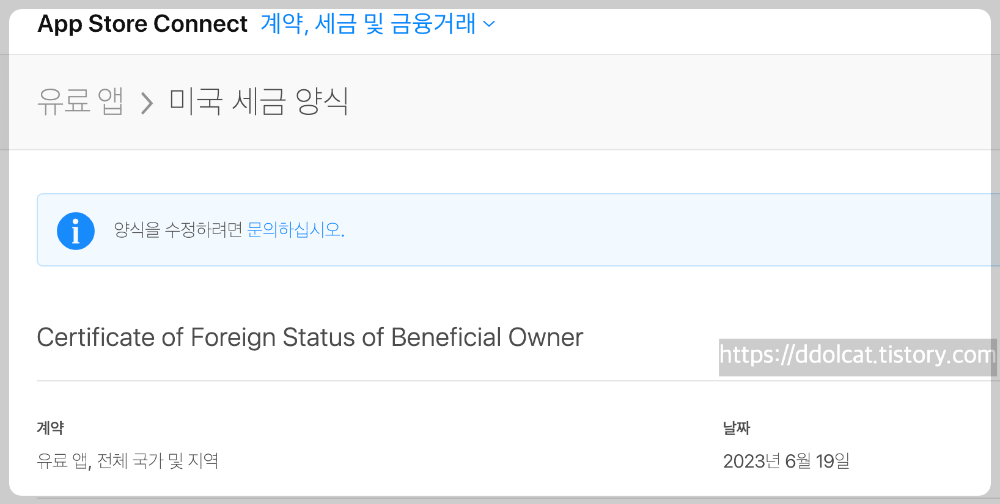 미국 세금 양식을 수정하면 애플 앱스토어에 문의를 넣어야한다.