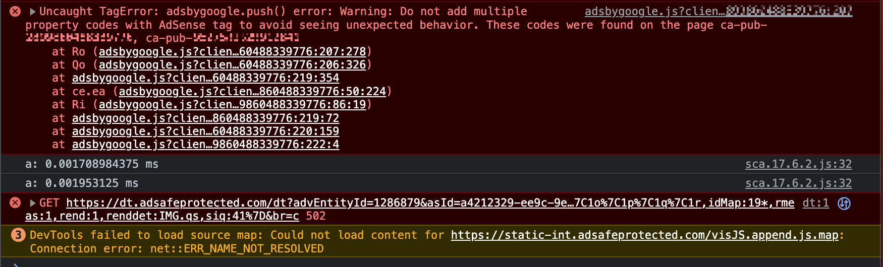 애드센스 pub 코드가 웹 페이지 내에 2개가 존재해서 발생하는 오류이다.