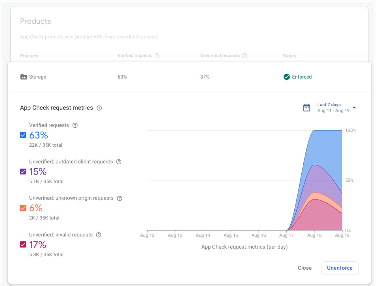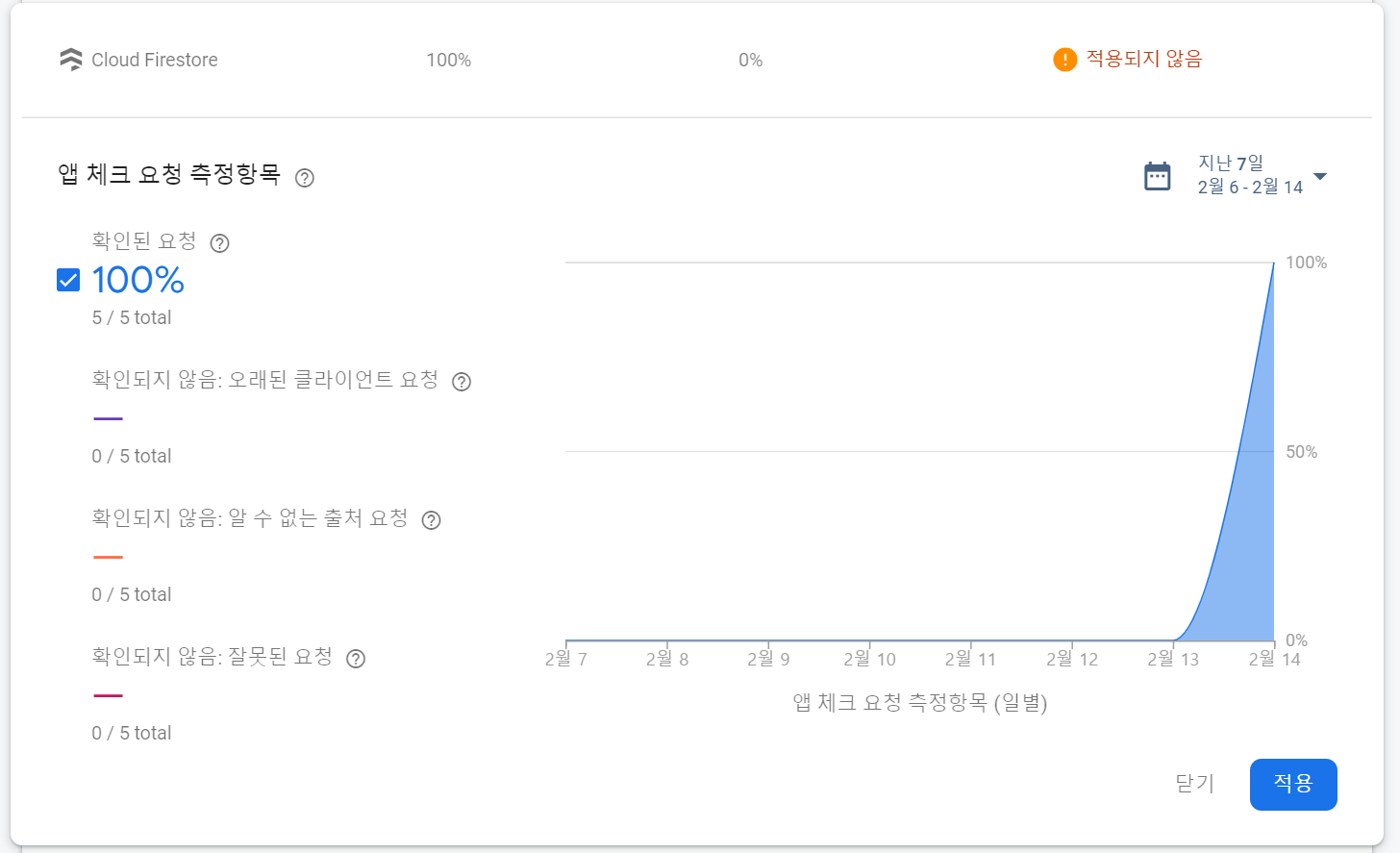 - 확인된 요청은 유효한 App Check 토큰이 있는 요청입니다. 앱 검사 시행을 활성화한 후에는 이 범주의 요청만 성공합니다.