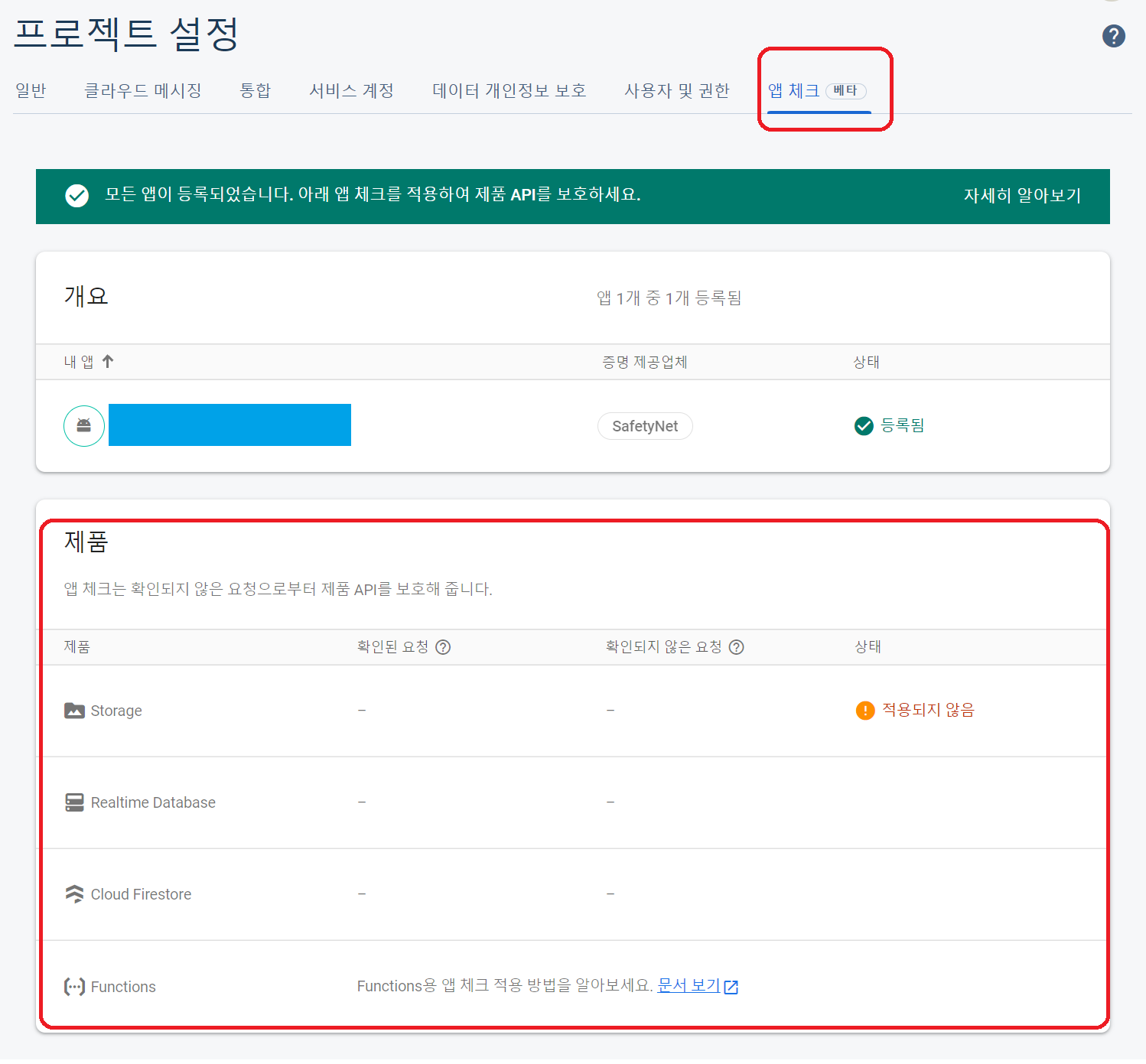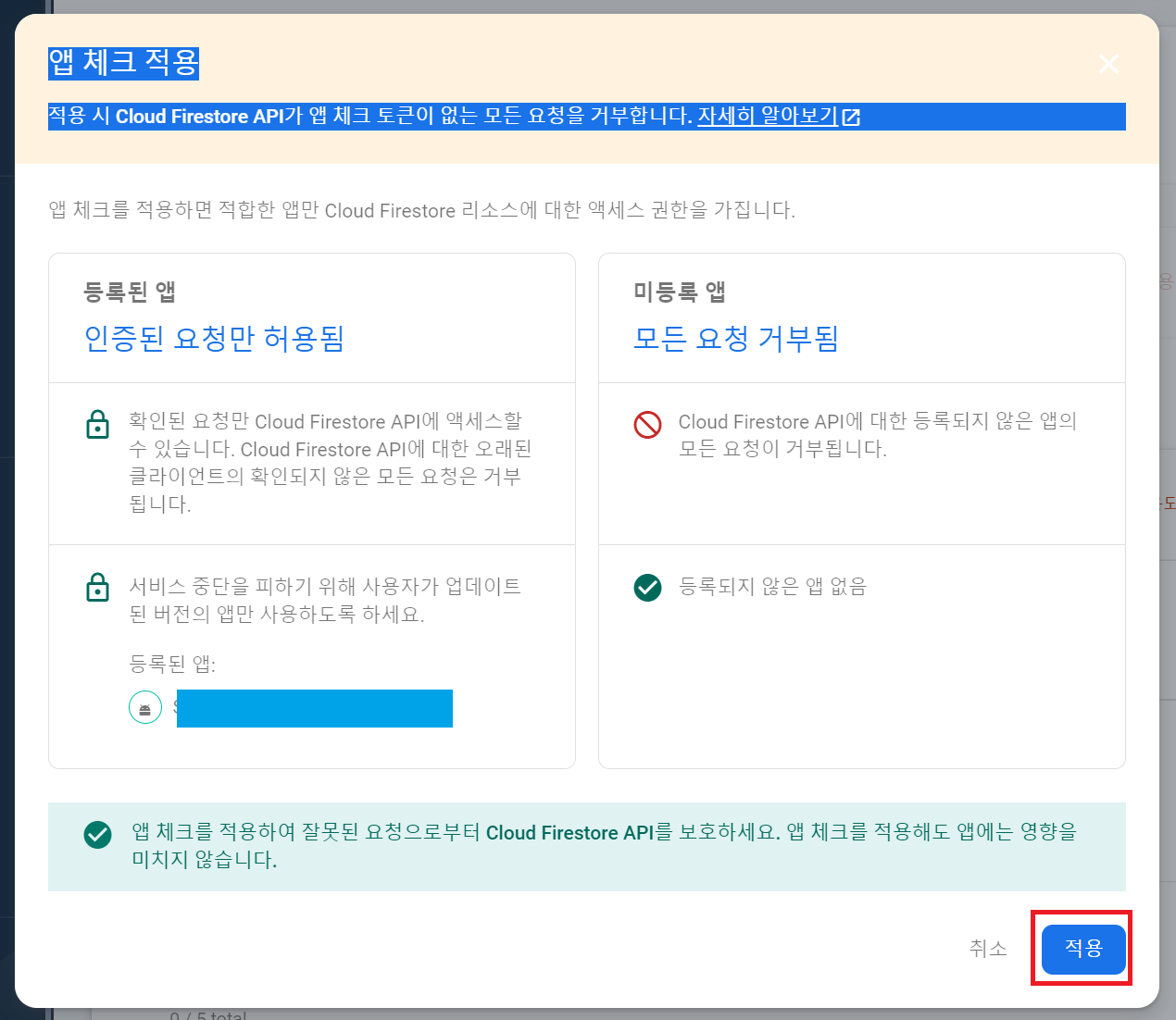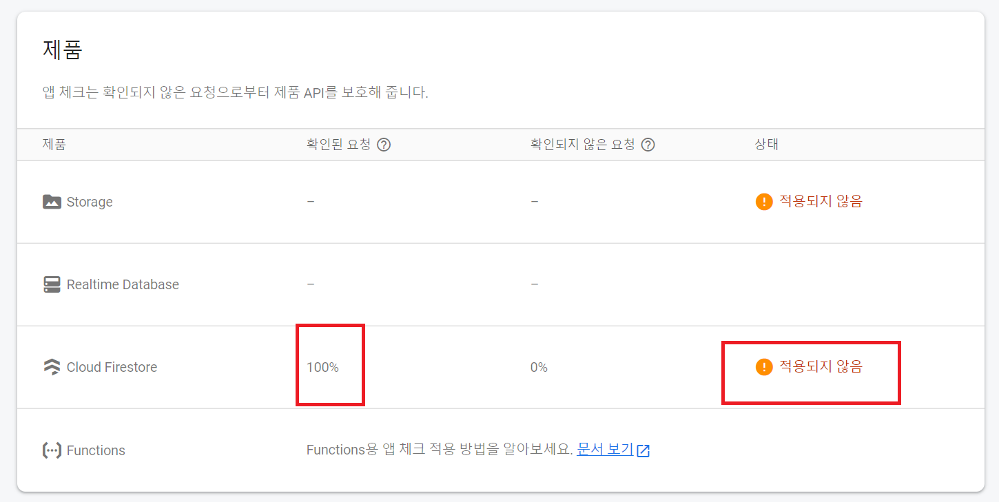 - App Check를 적용하여 앱을 출시하면 면 App Check를 사용하지 않는 기존 사용자들은 업데이트 전까지 접근할 수 없습니다.