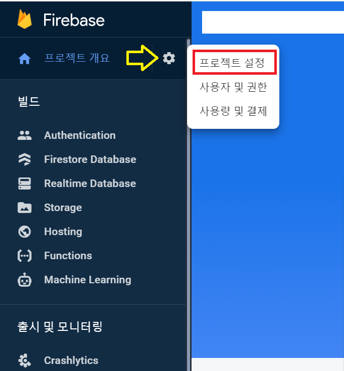 3. 파이베이스 콘솔에 로그인 > 프로젝트 개요 옆 톱니바퀴(설정) 버튼 클릭 > 프로젝트 설정 메뉴 클릭