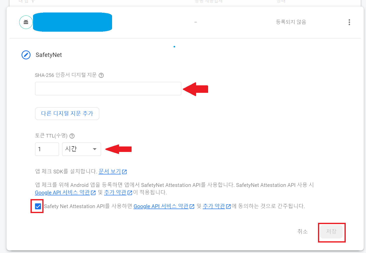 7. SHA-256 인증서 디지털 지문 등록 > 토큰 TTL(수명) 설정 > 약관 동의 후 저장 클릭