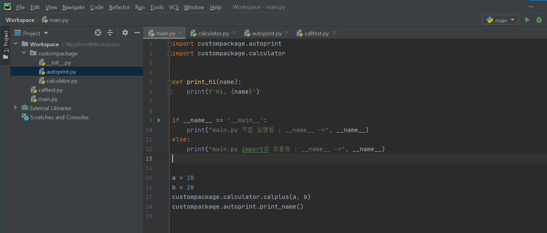 custompackage패키지를 하나 만들었습니다. 그리고 이 패키지 안에 calclulator.py 모듈과 autoprint.py모듈을 추가하였습니다. 그리고 main.py 모듈에서 custompackage패키지에 추가된 모듈 2개를 import 한 후 실행해보았습니다.