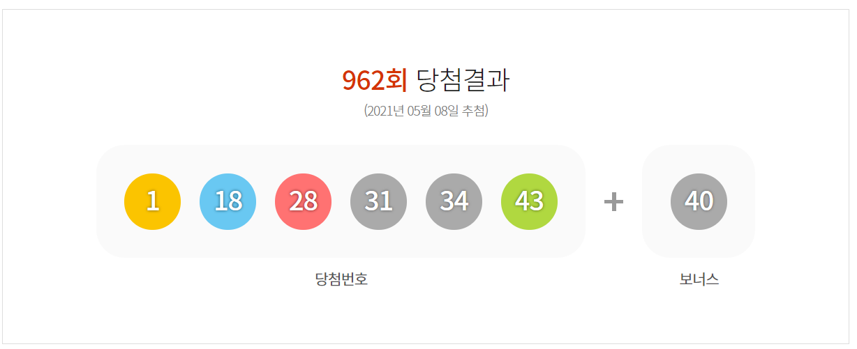 당첨번호는 1,18,28,31,34,43 입니다. 보너스 번호는 40입니다.