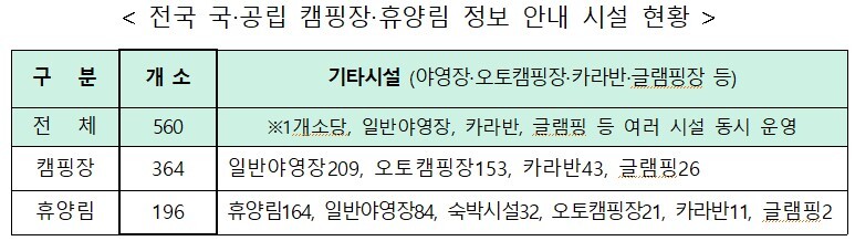 행정안전부는 전국 국공립 휴양림과 캠핑장, 오토캠핑장 안내 정보를 모아 공공자원 개방공유 사이트인 '공유누리'(www.eshare.go.kr)에서 제공합니다.