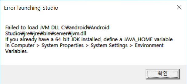 [윈도10] Android Studio 실행 오류 해결하기( jvm.dll 파일 읽기 오류)
