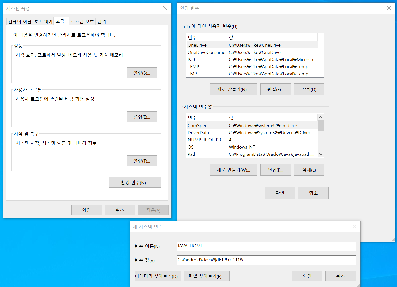 자바설치 후 환경변수도 지정하였으나 동일하게 오류가 발생 중이다.