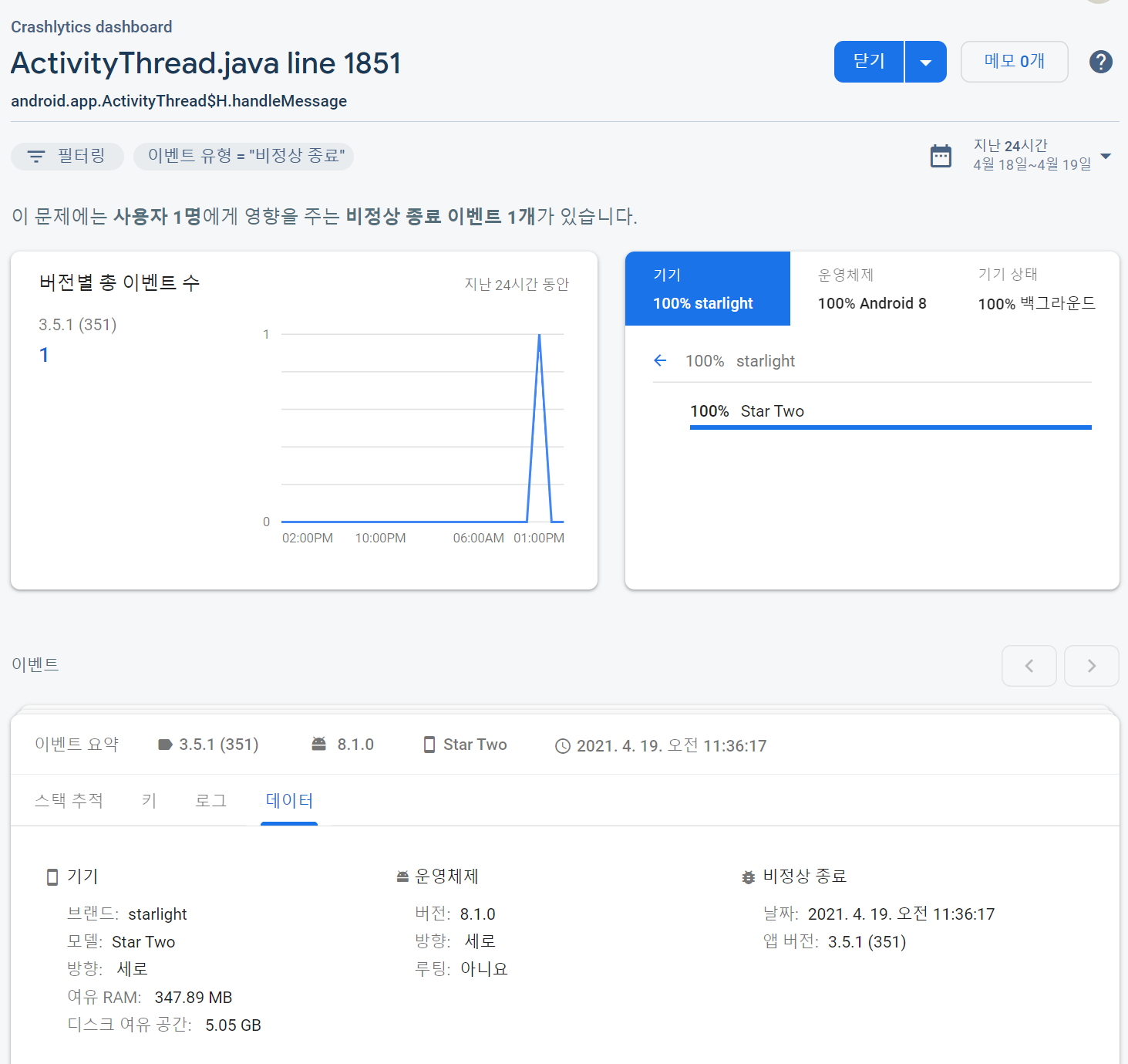 알수 없는 오류가 발생했다. starlight라는 브랜드 의 안드로이드8이 설치된 휴대폰에서 오류가 발생했다는 보고서 올라왔다. 백그라운드 서비스 실행 후 포그라운드 서비스로 올릴 때 리모트뷰를 사용하게 되어있다.