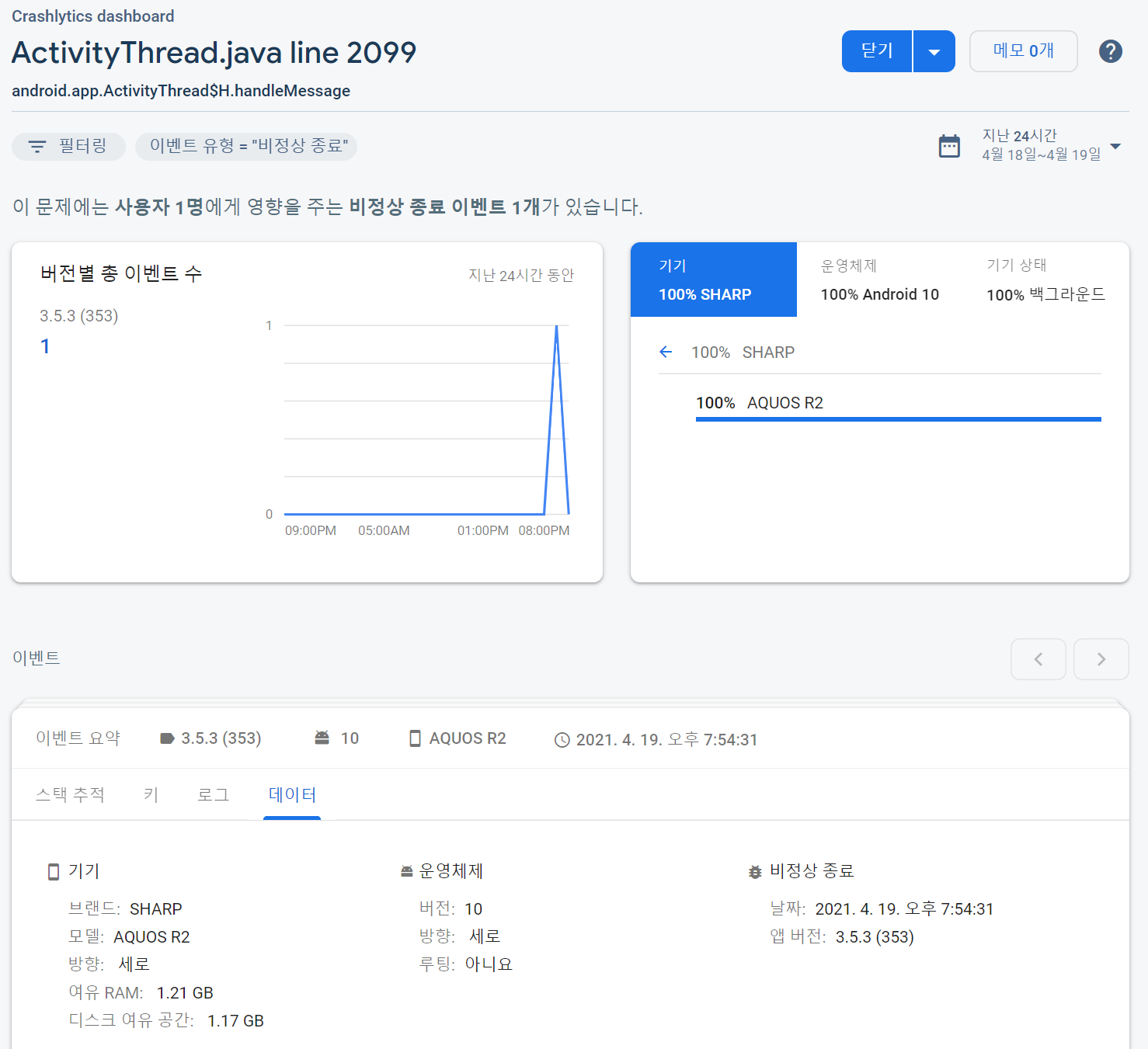 또 다른 폰에서 같은 증상이 발생되었다. 이번엔 SHARP 브랜드의 안드로이드10이 설치된 AQUOS R2폰이다.