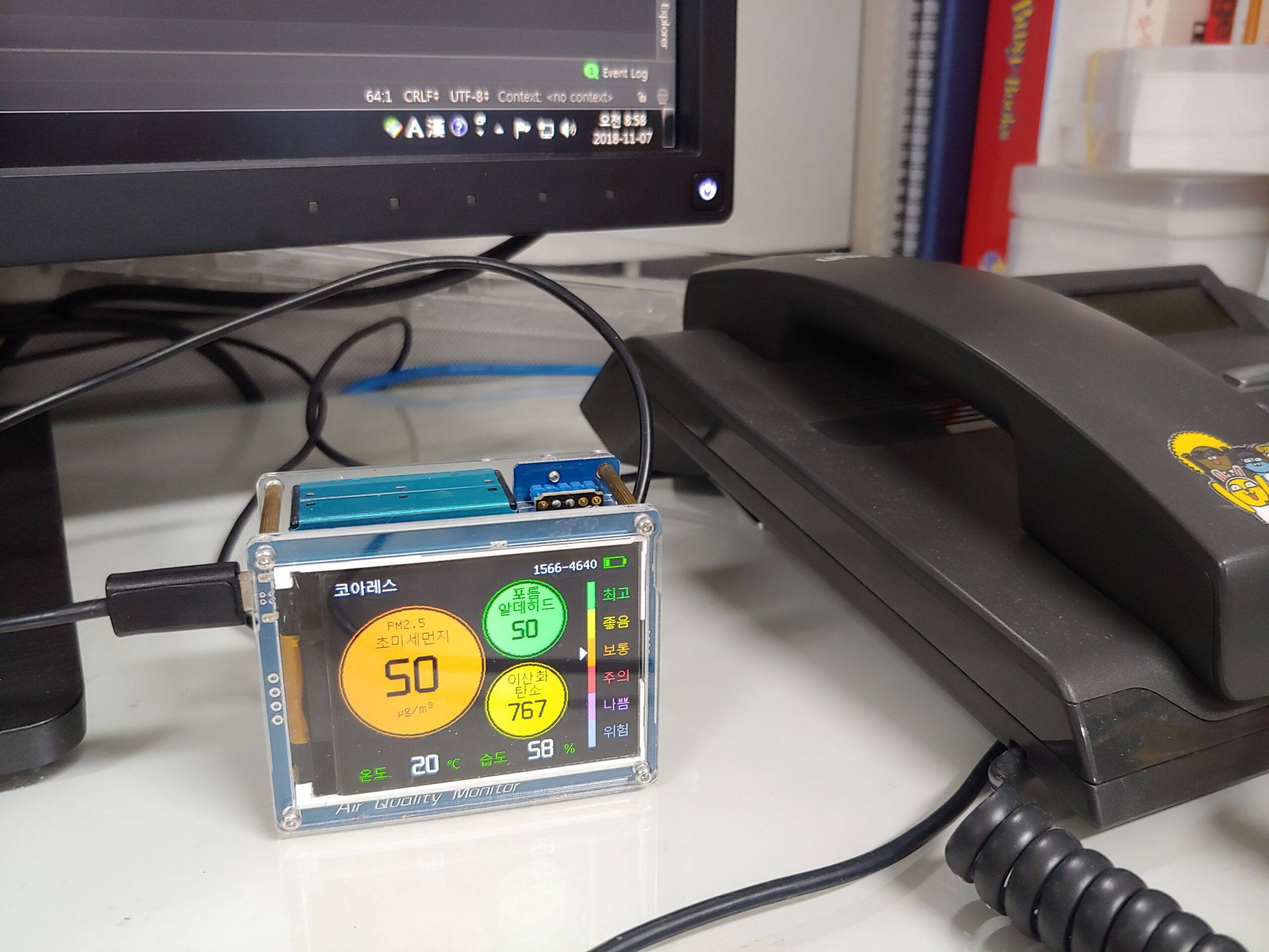 출근길에 집에서 사용중인 미세먼지 측정기를 가지고 출근하였다.