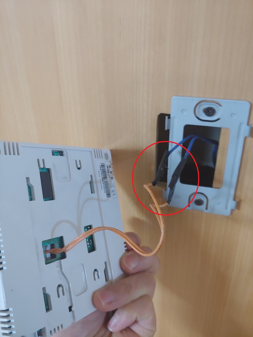 STEP 2. 벽에 붙은 보일러 컨트롤러를 위로 밀어 올린 후 절전테이프를 제거하고 연결된 선을 분리하세요.