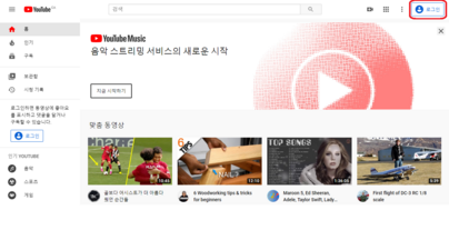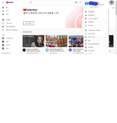 계정 생성 후 유투브 사이트에 로그인하면 오른쪽 상단에 “G”를 클릭하면 메뉴가 나타난다.