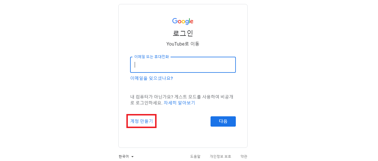 유투버가 되기 위한 첫 걸음으로 유투브를 로그인하기 위한 계정을 생성해야한다.