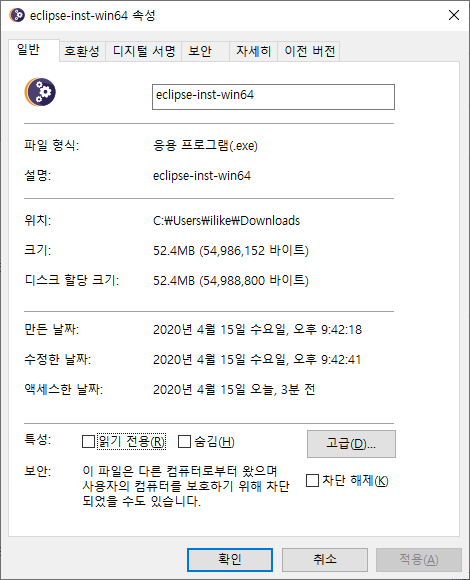 eclipse-inst-win64.exe파일을 다운 받은 후 클릭하여 설치를 시작한다. 설치 프로그램 용량은 52메가 입니다.