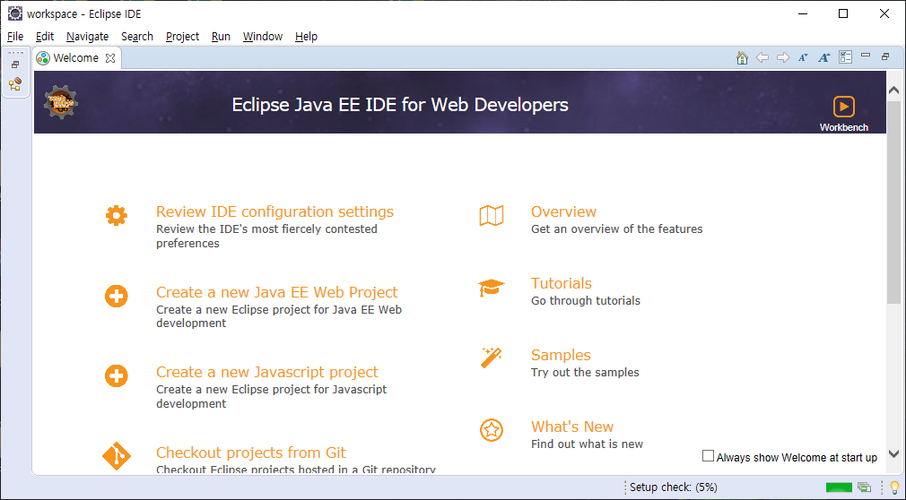 9. 실행이 완료되었다. Workbench 버튼을 클릭하여 Welcome 창을 닫거나, 웰컴창에서 클릭하여 프로젝트 생성도 가능하다.