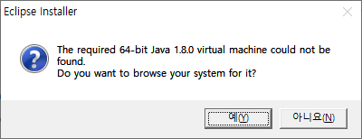 설치를 시작해보자. eclipse-inst-win64.exe 파일을 클릭하여 실행한다. Java가 설치되어 있지 않다면 아래와 같은 안내창이 노출된다. 이미 설치했다면 예(Y)를 누르고 설치된 폴더를 찾아주면 된다. 자바프로그램을 설치하지않았다면 설치를 해야한다. 아래링크에서 다운받아 설치를 하자.