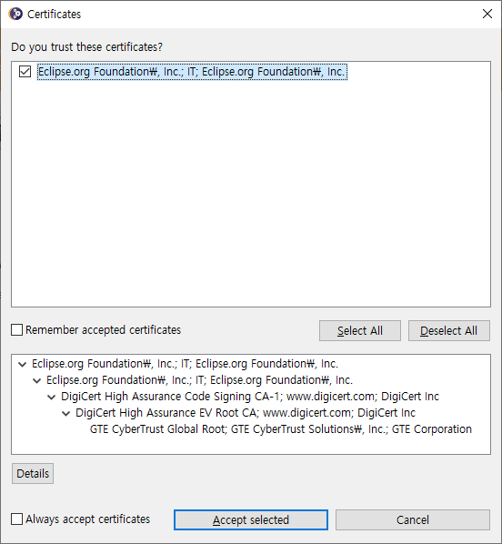6. 설치진행중 나타나는 Certificates 창이다. 체크 후 Accept select를 클릭한다.