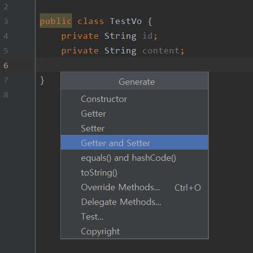 Getter and Setter는 Generate 기능을 사용하여 자동 생성하면 편리하다. 선언된 모든 멤버변수에 대한 수작업은 노가다이다. 머리에 익히기 위한 타이핑은 강추한다.