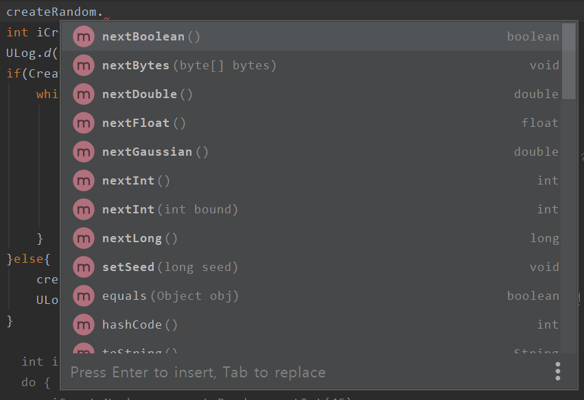 Random클래스의 객체는 ceateRandom으로 초기화 하였다. Random 클래스에는 nextInt()와 같은 메소드가 있다.