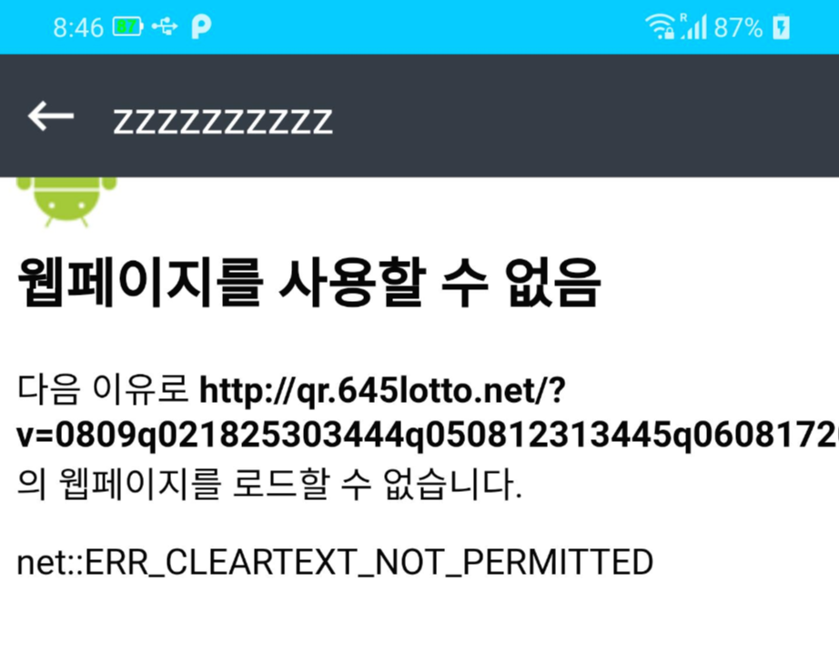 QR코드 라이브러리를 가지고 테스트하는 과정에 오류가 발생하였다. 웹뷰에서 url를 하나 열었는데 “웹페이지를 사용할 수 없음” 오류가 발생하였다. “net::ERR_CLEARTEXT_NOT_PERMITTED”