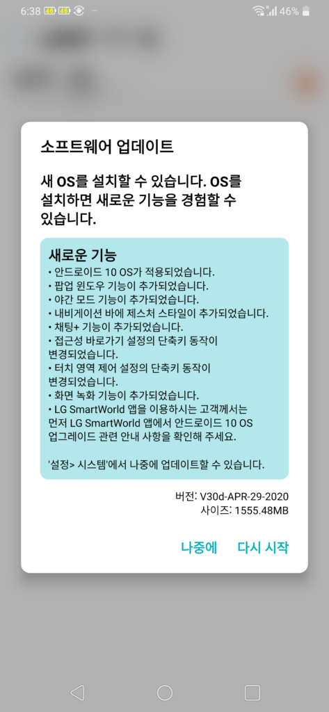 기다리고 있었다. 내가 사용 중인 LG전자 G7은 언제 운영체제 업데이트를 해줄까, 해주긴할까? 드디어 오늘 소프트웨어 업데이트 알림이 떴다.