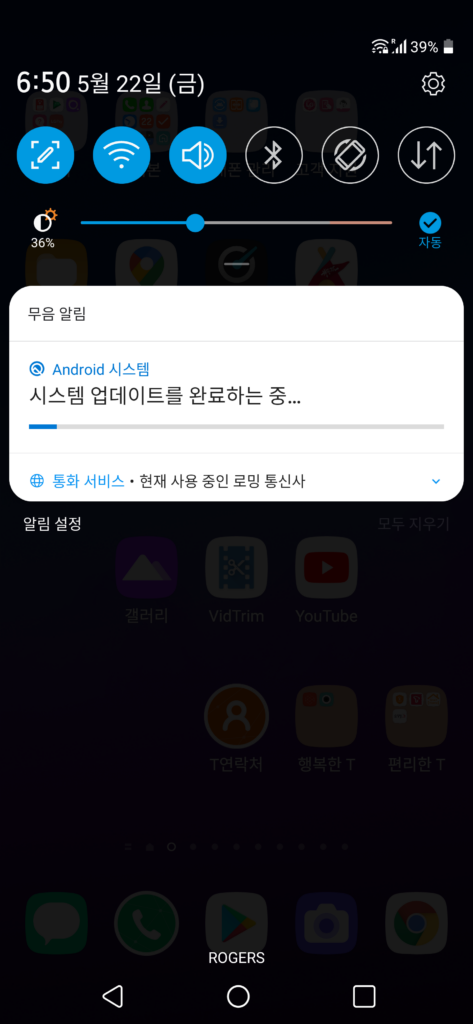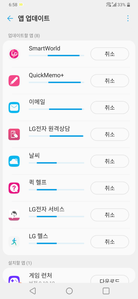 LG전자 폰 구입시 기본적으로 설치 되어 있던 앱들도 대거 앱 업데이트가 진행되었다. 한참을 지나도 업데이트가 완료되지 않는 모양새다. 일단 급한거 없으니, 앱 업데이트는 모두 취소 하였다.