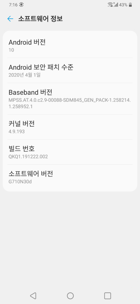 소프트웨어 정보에 Android 버전 10이 표기 된다. 업데이트가 완료 되었다.