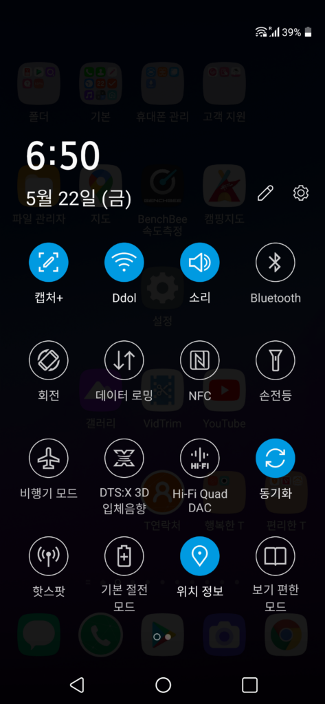 휴대폰 상단을 드래그하여 커튼식 메뉴를 내려보았다. 다크 테마로 보여진다. 유일하게 이 부분만 배경색이 다크이다.