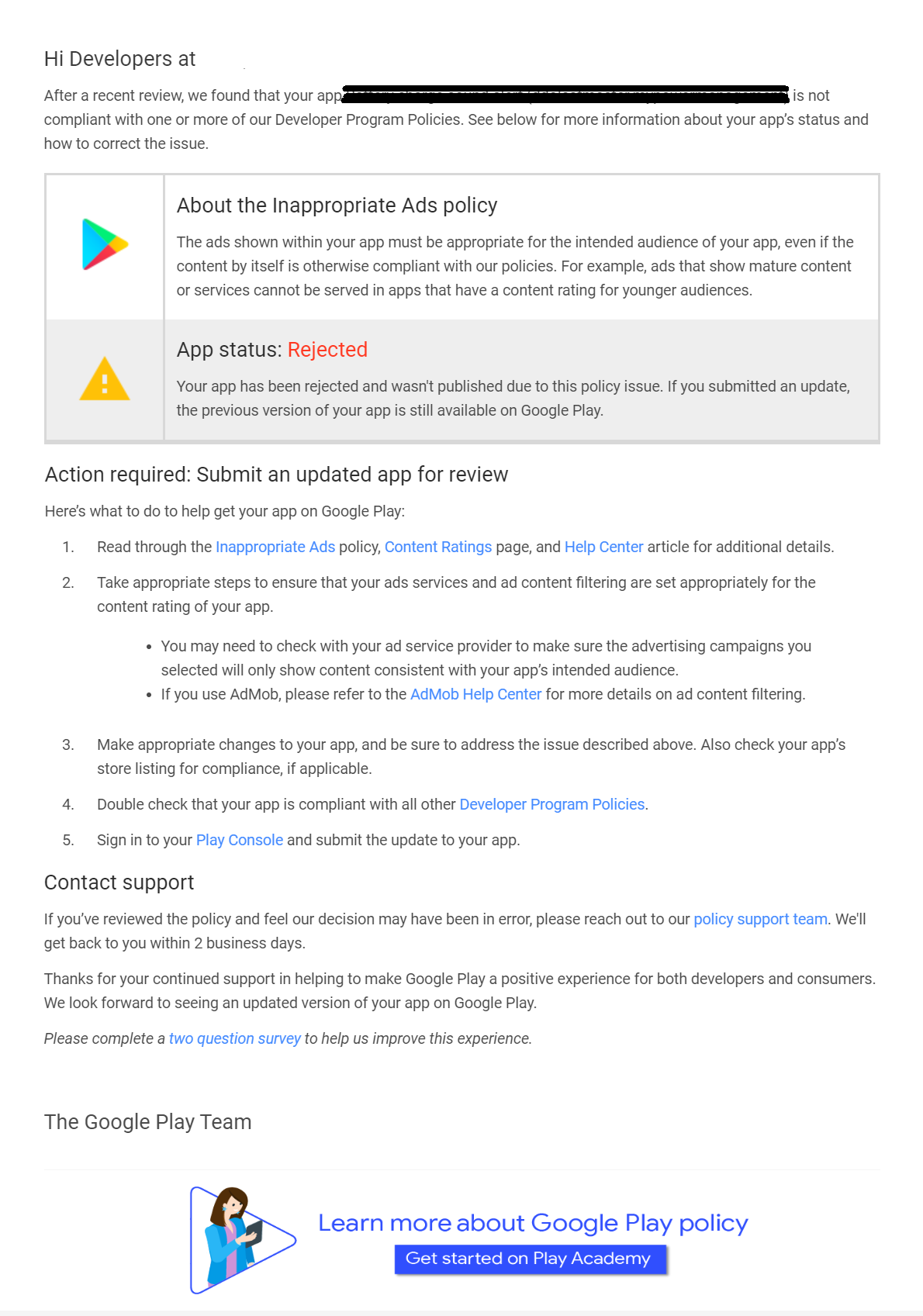최근에 앱에 버그가 있어서 업데이트를 하였다. 업데이트 하는 과정에 웹뷰를 하나 추가하였고, 웹뷰아래에 반응형 배너 광고를 하나 추가하였다. 그런데 오늘 앱이 마켓에서 삭제되었다는 메일이 왔다. 아 정말 징글징글하다. 구글 정책이 변경될 때 마다 곤욕스럽다. 위반 내용의 메일 내용은 아래와 같다.