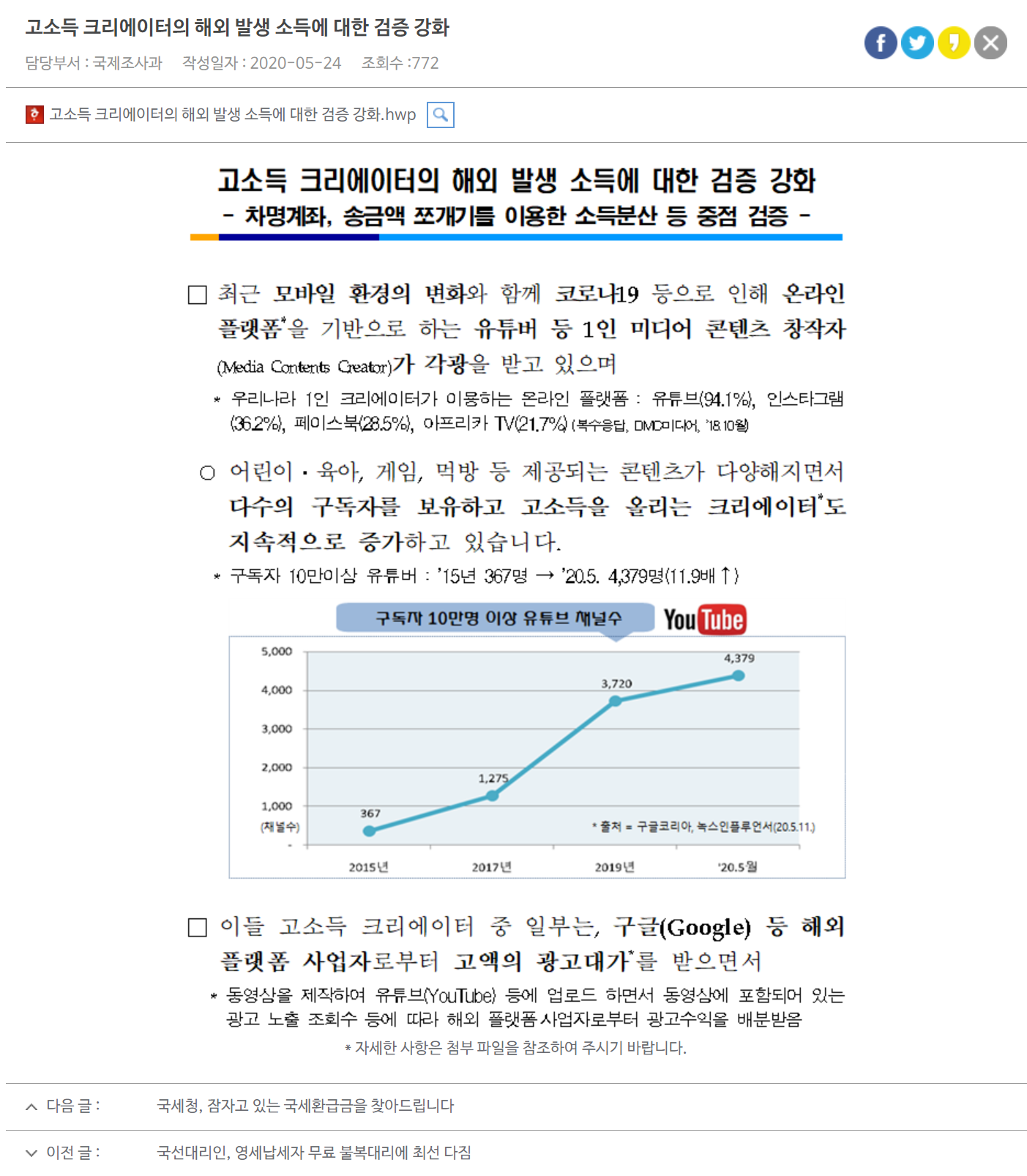 고소득 크리에이터의 해외 발생 소득에 대한 검증 강화(2020.05.24)
