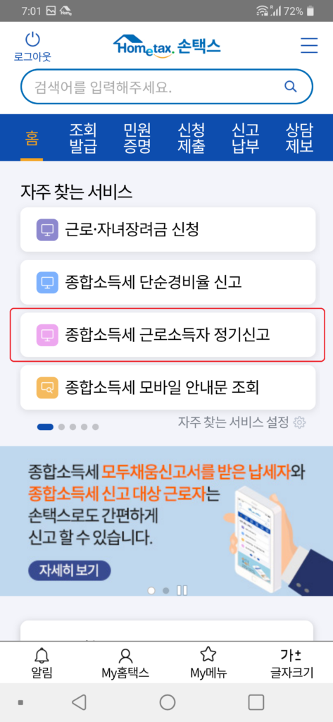 [스탭3] “종합소득세 근로소득자 정기신고”를 클릭