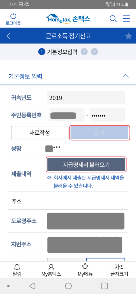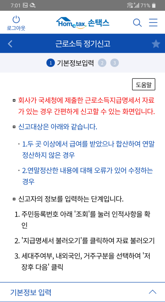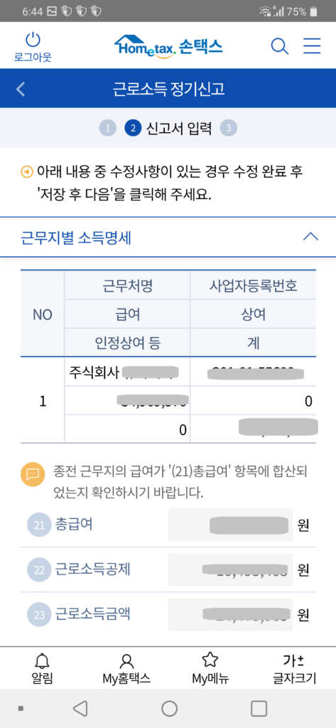 [스탭5] 신고서 입력란을 작성하는데, 별도로 할 건 없다. 내가 사용한 카드내역, 보험료 납부 등의 정보는 표기가 안되지만 이미 다 적용되어 있었다.