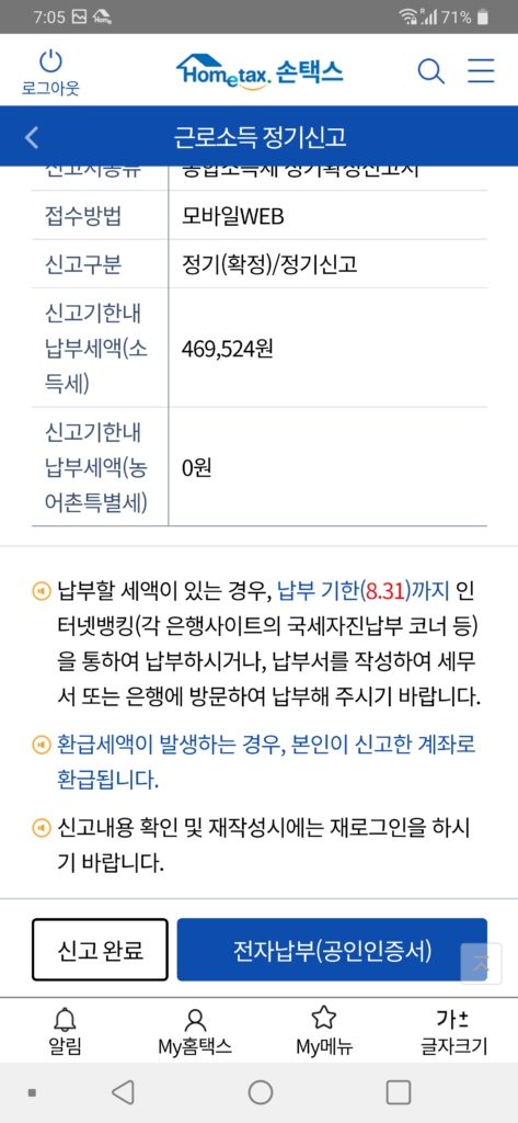 전자납부를 눌러서 바로 납부도 가능하며, 올해는 코로나바이러스 여파로 납부기한이 8월31일까지 연장되었다. 정보가 없어서 답답했는데, 직장 퇴직 후 연말정산 하는 방법을 알게되어 좋다. 만약 퇴직일 기준으로 급여가 그렇게 많지 않다면 신고해도 그만 안해도 그만이라는 얘기가 있다. 그래도 혹시 모르니 하면 좋을 것 같다. 왜냐하면, 돌려 받을 세금이 발생할 수도 있지 않을까? 라는 생각이 든다.