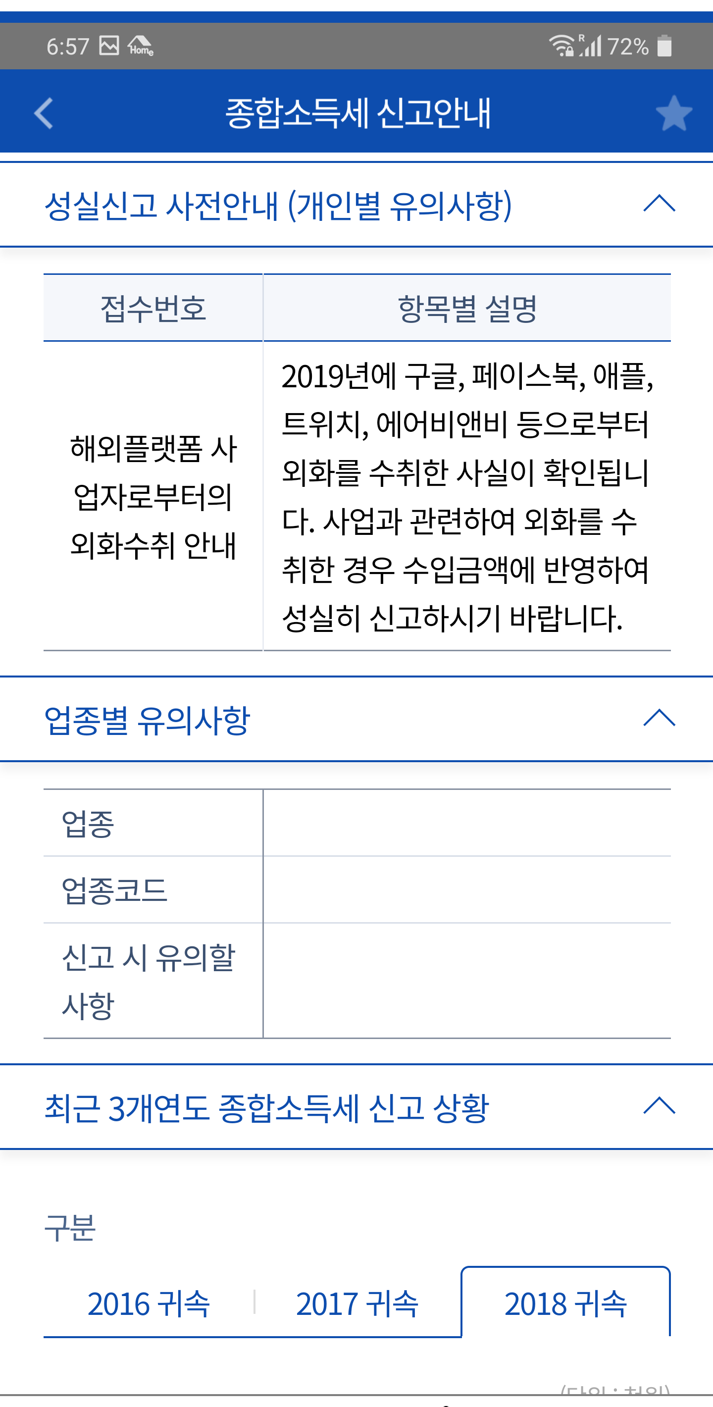 해외플랫폼사업자로 부터의 외화수취안내만 있고 2016년, 2017년, 2018년 귀속 구분만 있고, 아무런 정보가 없었다.