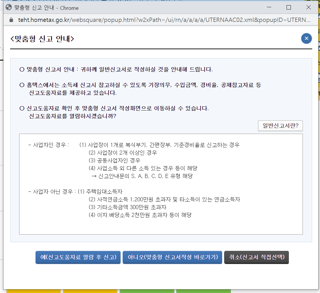예를 눌러서 확인 후 “일반신고서”를 작성해도 되고, 아니오를 누른 후 바로 신고를 시작해도 된다.