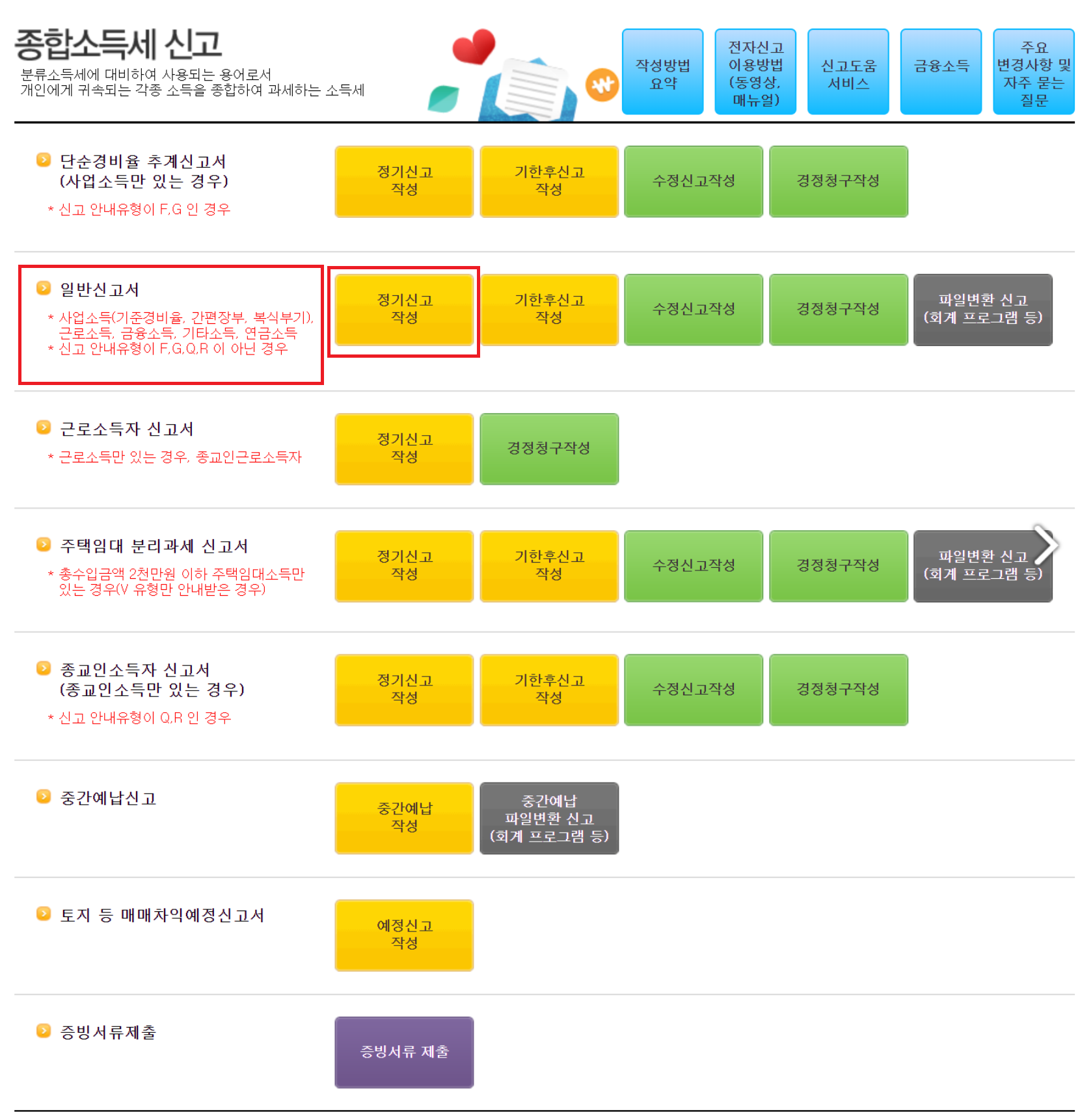 그 다음, 일반신고서 , “정기신고 작성”을 클릭한다.