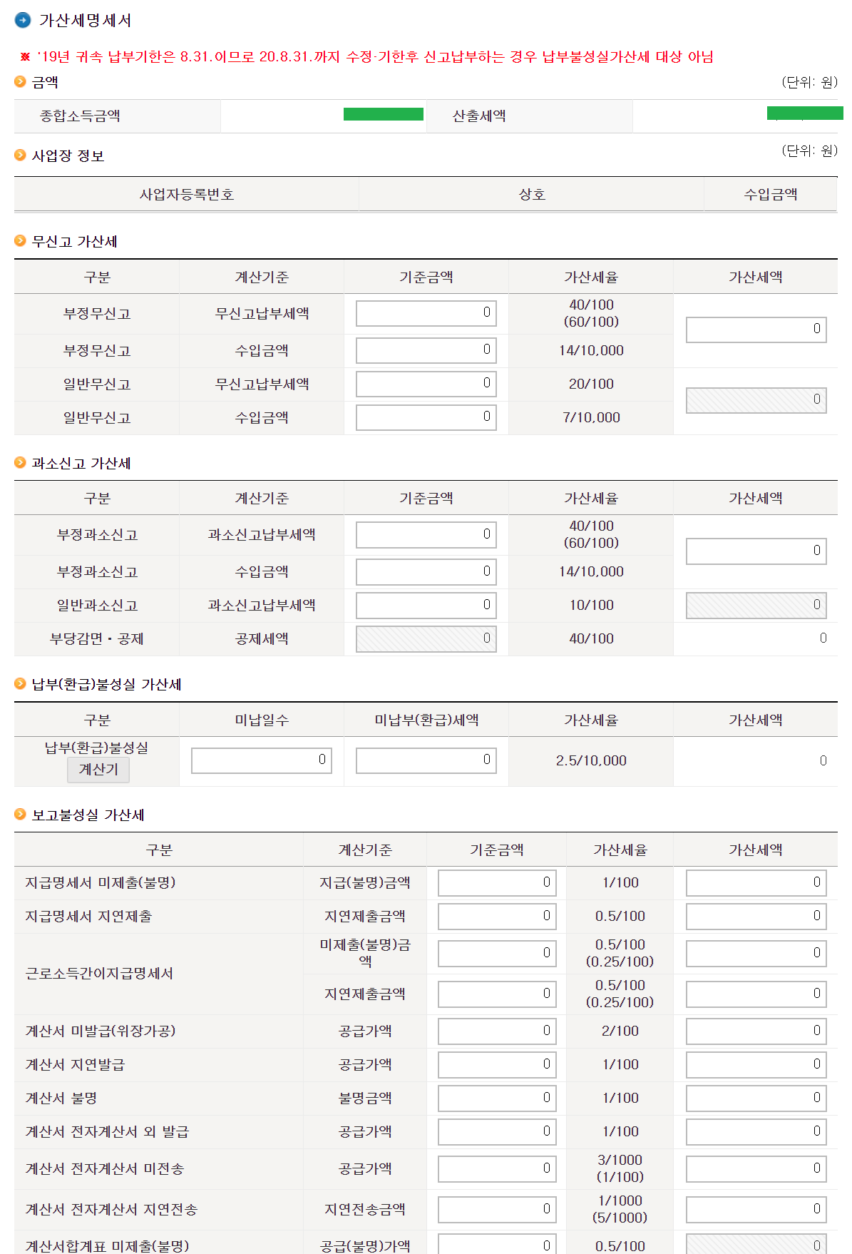가산명세서 ==> 납부기간에 신고를 하면 대상이 아님으로 다음으로 넘어간다.
